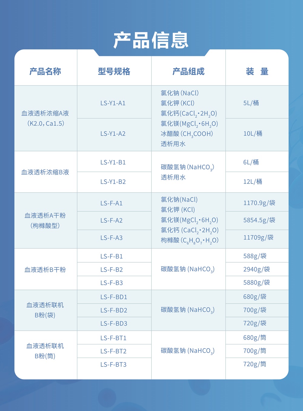 目前透析治療中絕大多數患者使用常規濃度的透析濃縮物(鉀2.0,鈣1.5型),而產品中的有機酸成分主要為透析液使用冰醋酸、透析干粉使用枸櫞酸。公司產品共16種型號規格,囊括了透析液、透析干粉、聯機B干粉等產品的各種裝量規格,能夠匹配各主流品牌的血液透析機,滿足透析中心對產品的使用需求。