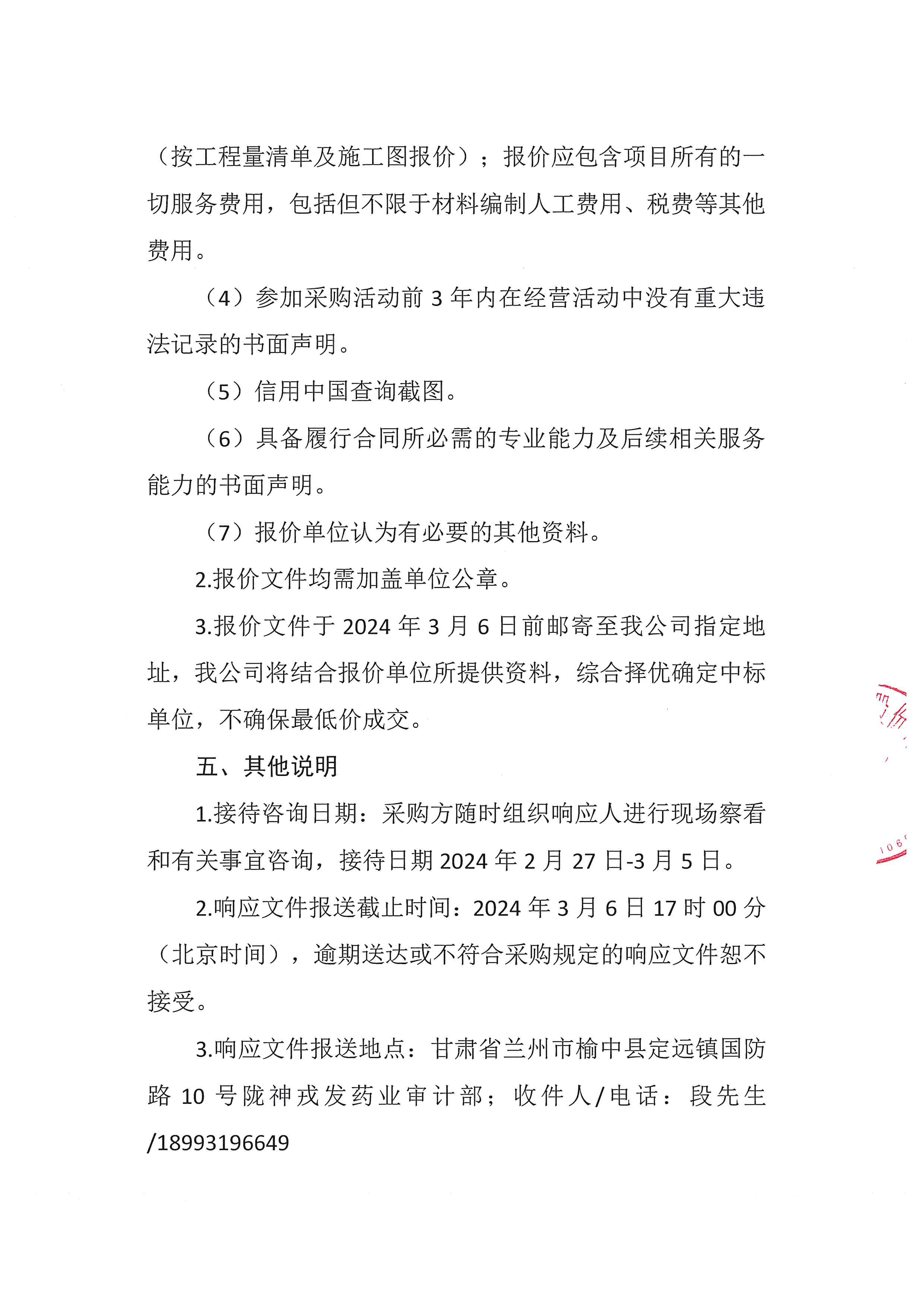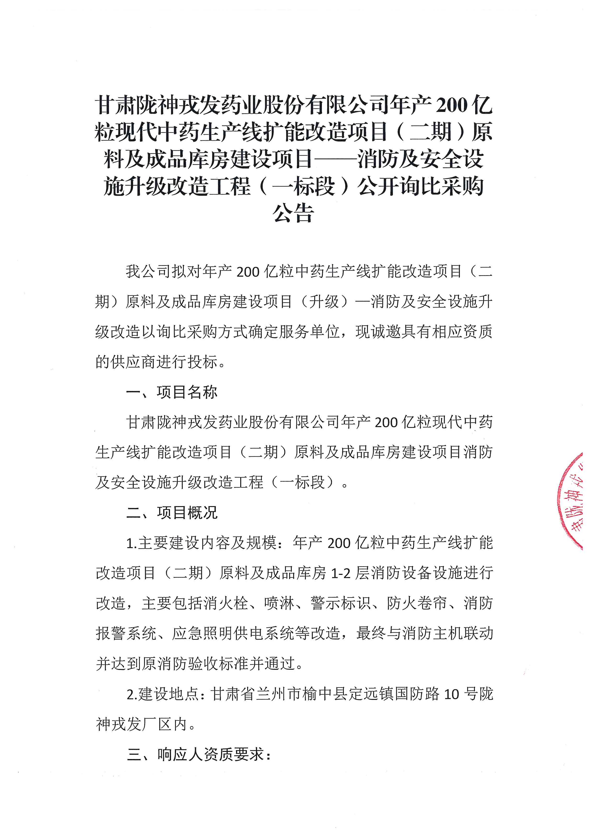 甘肅隴神戎發藥業股份有限公司年產200億?,F代中藥生產線擴能改造項目(二期)原料及成品庫房建設項目——消防及安全設施升級改造工程(一標段)公開詢比采購公告