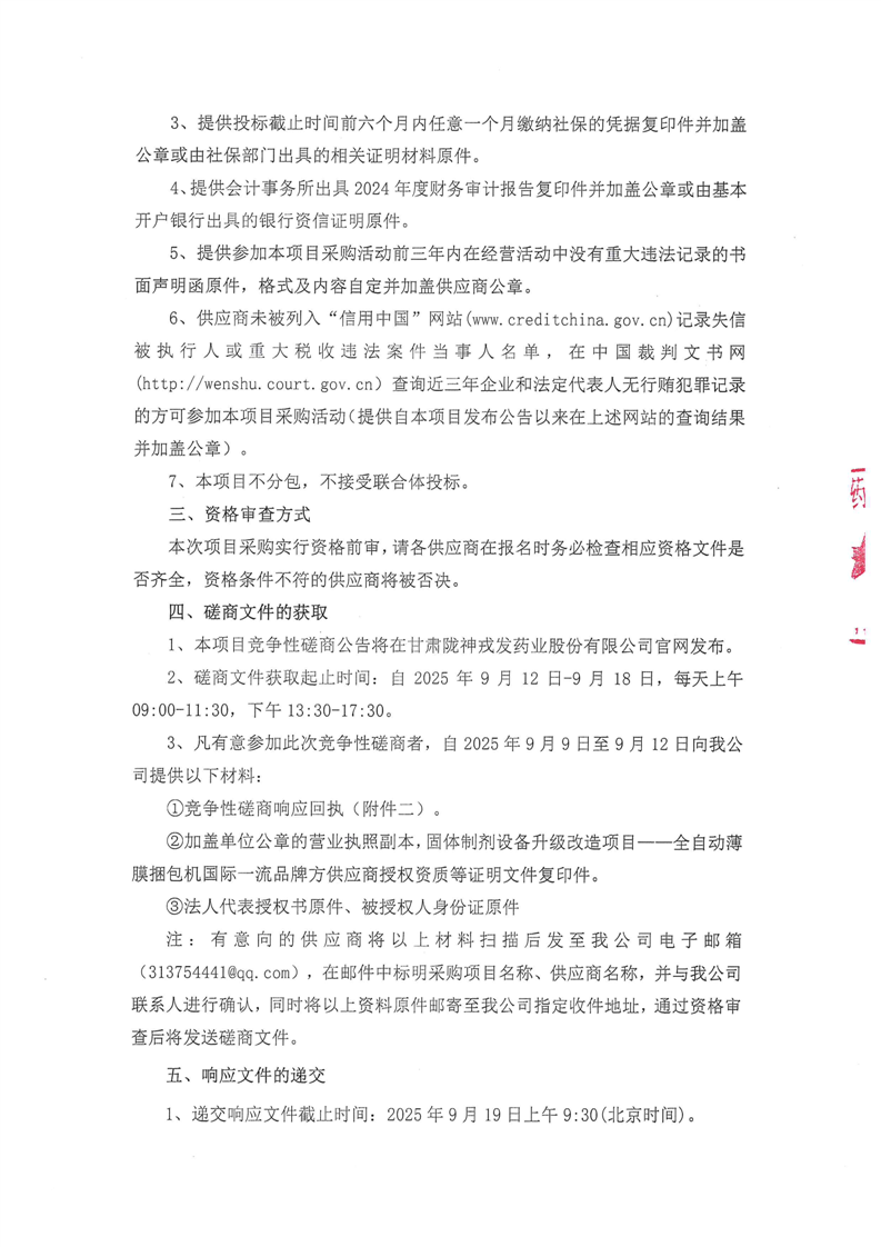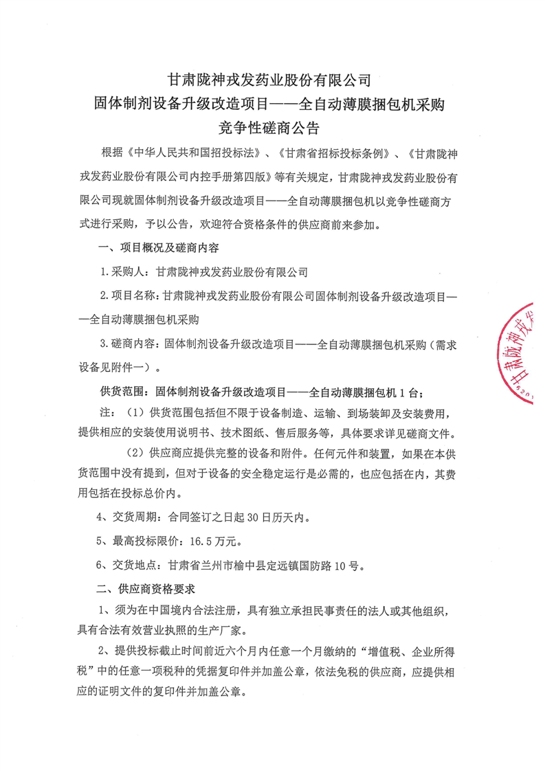 甘肅隴神戎發藥業股份有限公司固體制劑設備升級改造項目--全自動薄膜捆包機采購競爭性磋商公告