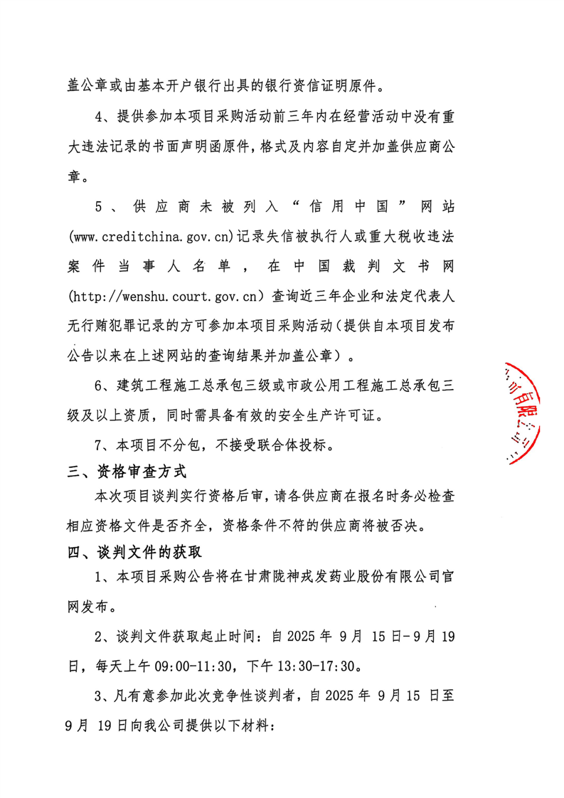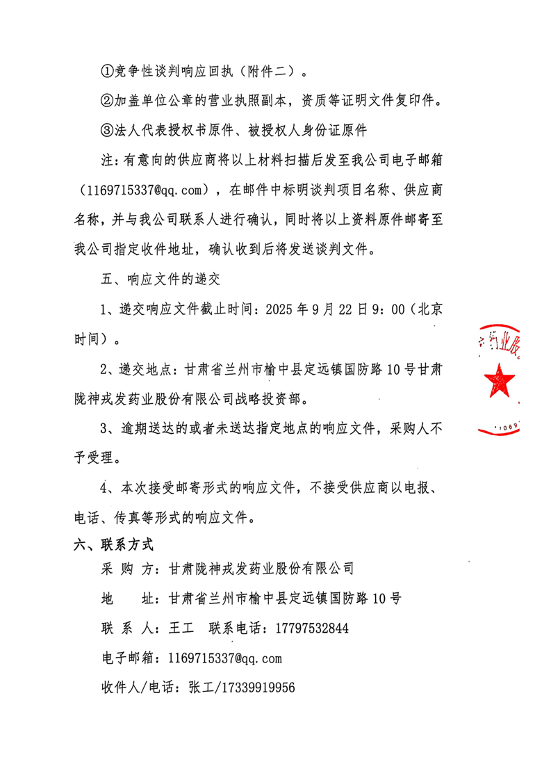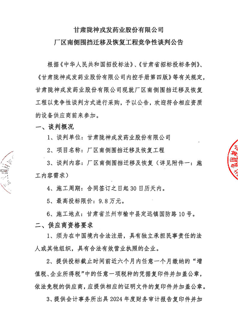 甘肅隴神戎發(fā)藥業(yè)股份有限公司廠區(qū)南側(cè)圍擋遷移及恢復(fù)工程競爭性談判公告