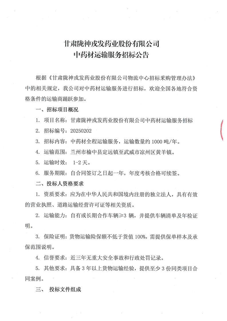 甘肅隴神戎發藥業股份有限公司中藥材運輸服務招標公告