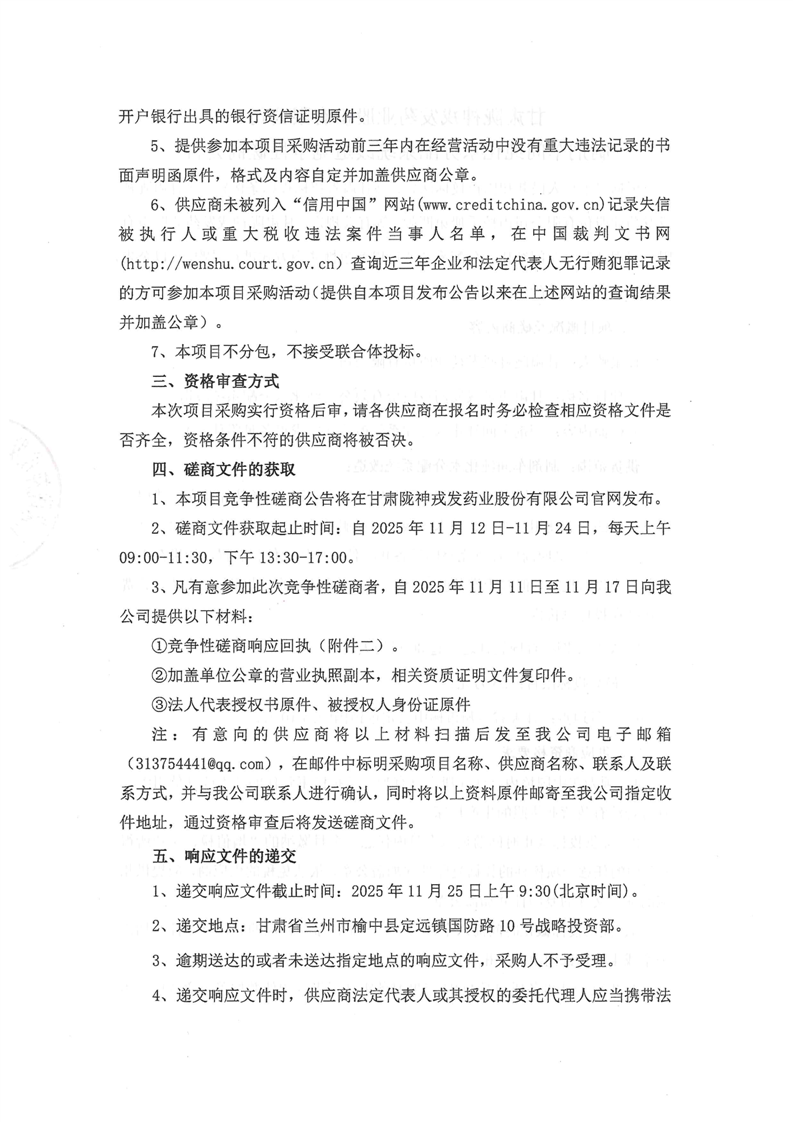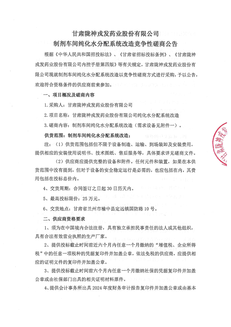 甘肅隴神戎發藥業股份有限公司制劑車間純化水分配系統改造競爭性磋商公告
