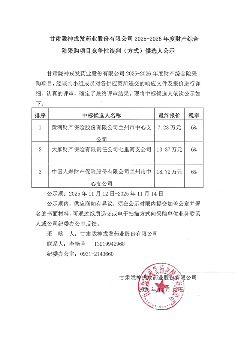 甘肅隴神戎發藥業股份有限公司2025-2026年度財產綜合險采購項目競爭性談判(方式)候選人公示