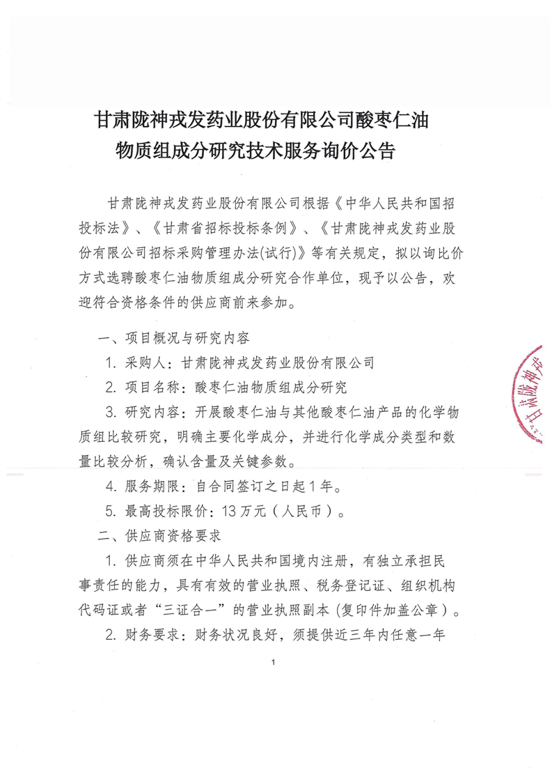 甘肅隴神戎發(fā)藥業(yè)股份有限公司酸棗仁油物質(zhì)組成分研究技術(shù)服務(wù)詢(xún)價(jià)公告