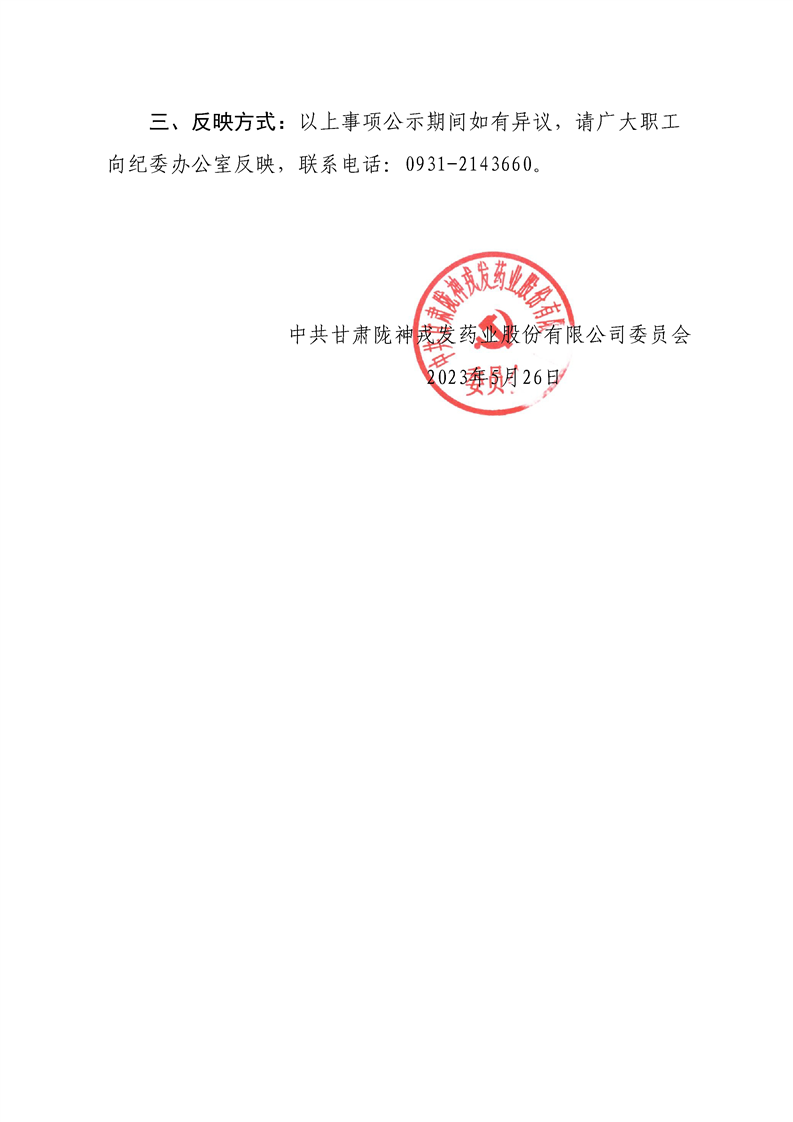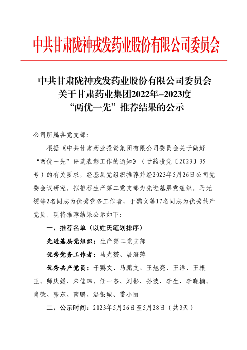 中共甘肅隴神戎發藥業股份有限公司委員會關于甘肅藥業集團2022年-2023度“兩優一先”推薦結果的公示