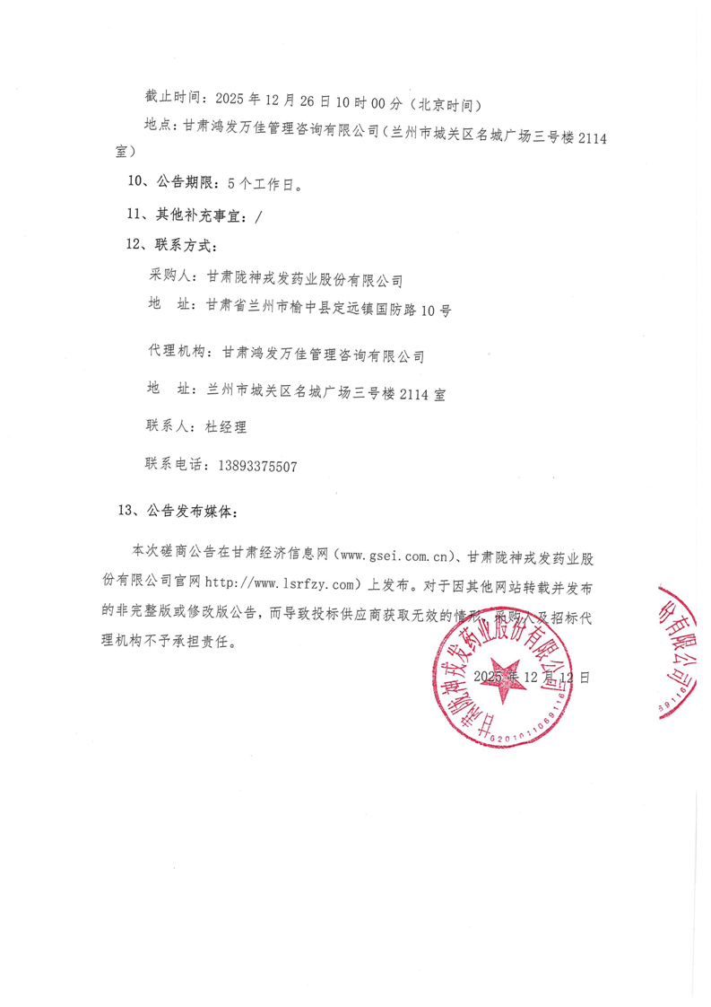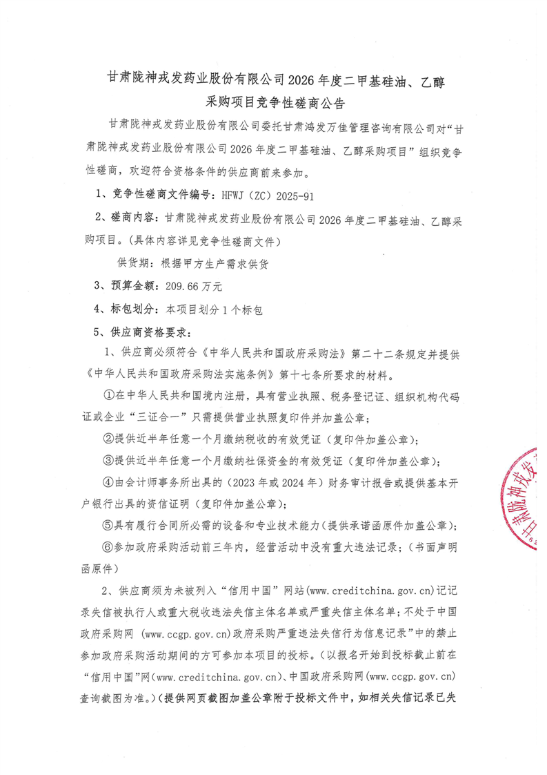 甘肅隴神戎發(fā)藥業(yè)股份有限公司2026年度二甲基硅油、乙醇采購(gòu)項(xiàng)目競(jìng)爭(zhēng)性磋商公告