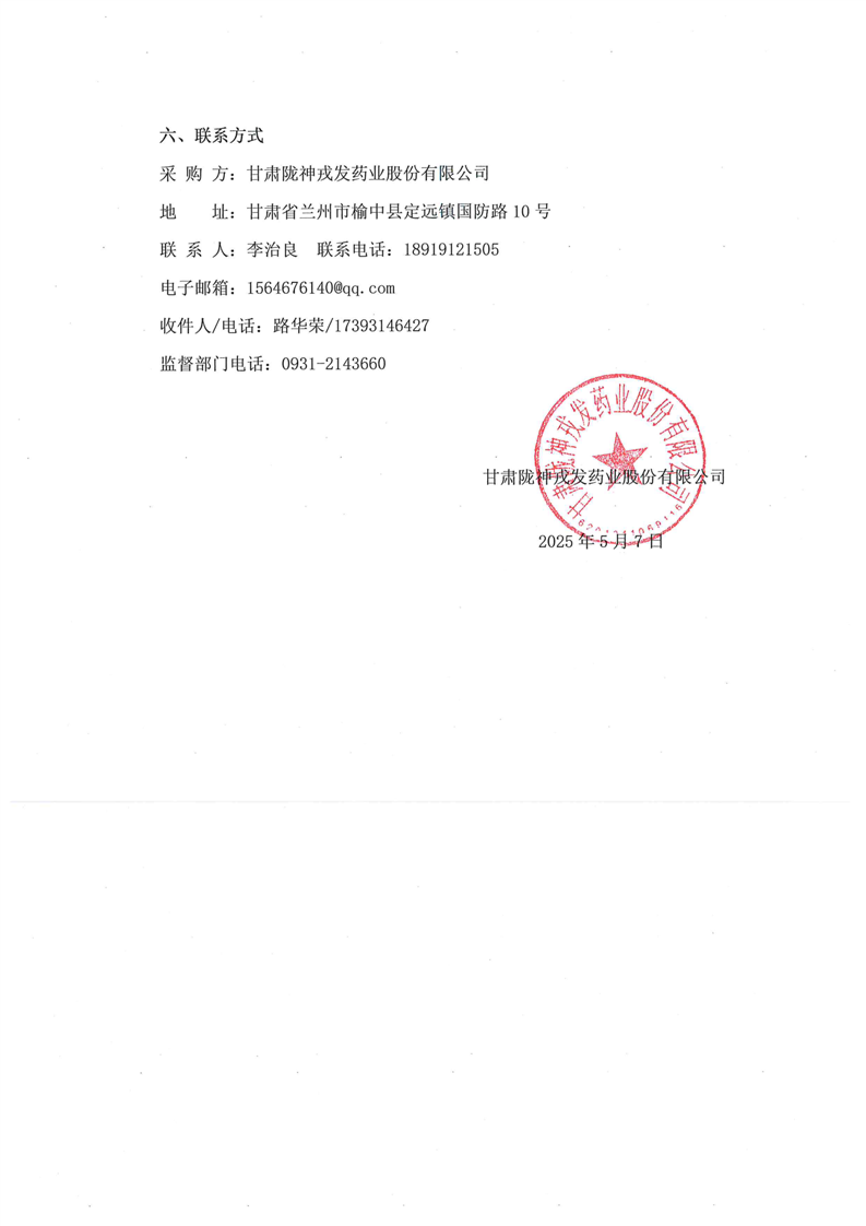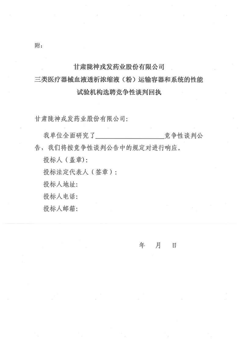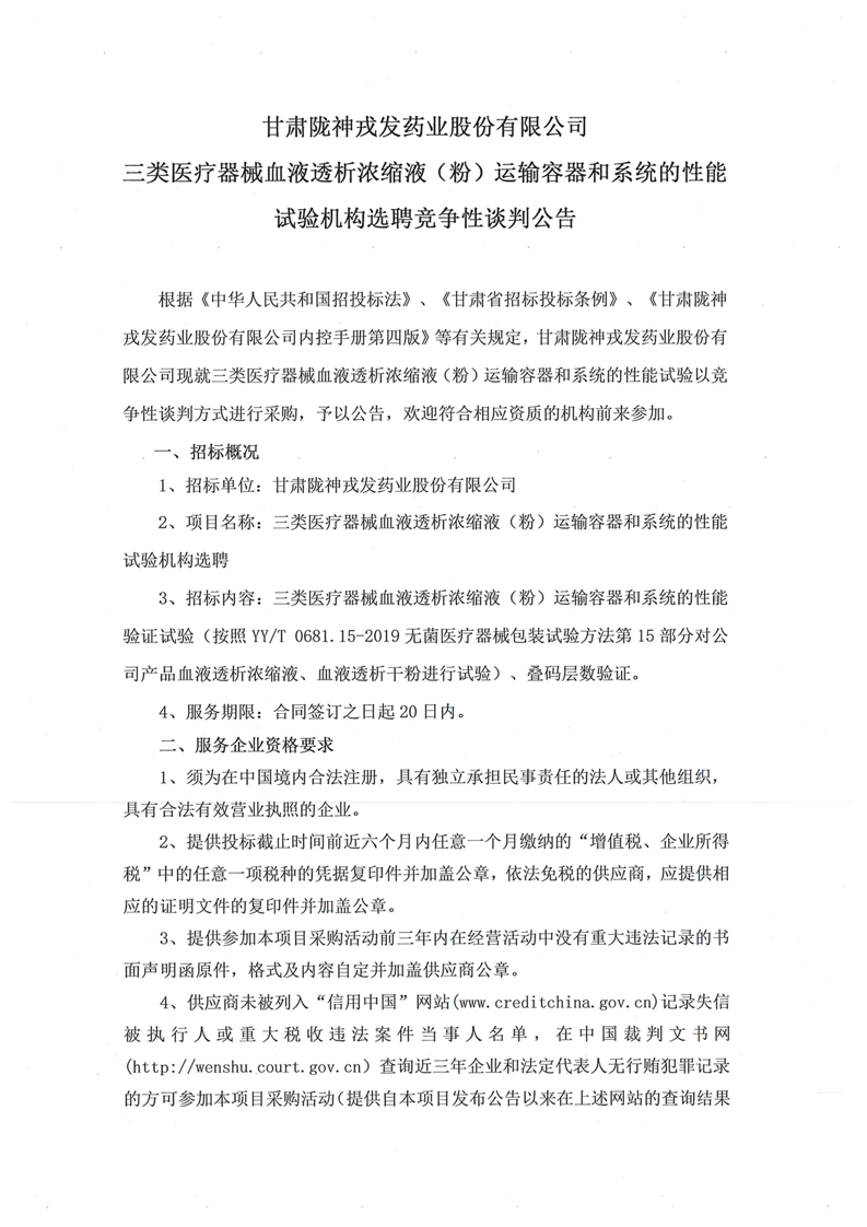 甘肅隴神戎發藥業股份有限公司三類醫療器械血液透析濃縮液(粉)運輸容器和系統的性能試驗機構選聘競爭性談判公告