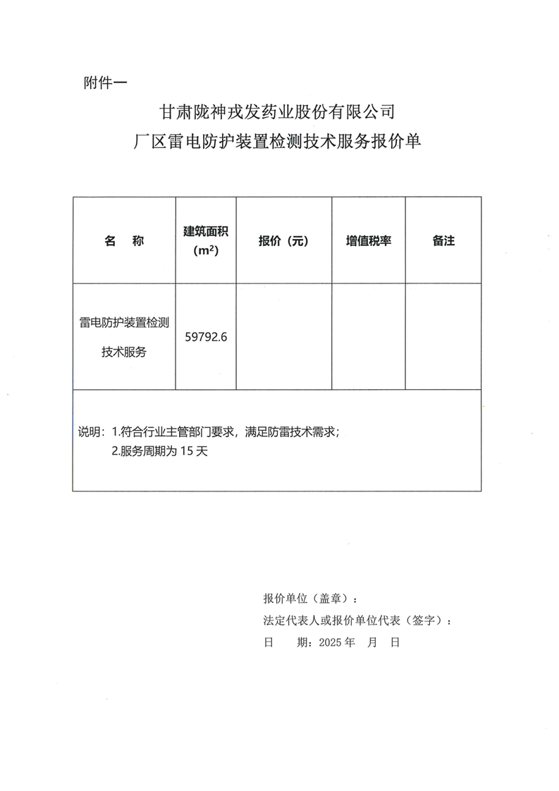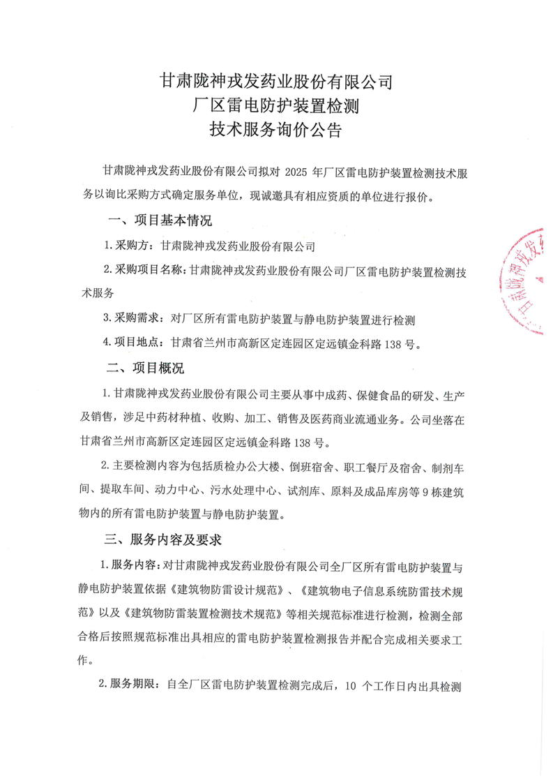 甘肅隴神戎發藥業股份有限公司廠區雷電防護裝置檢測技術服務詢價公告