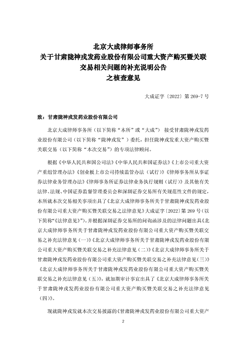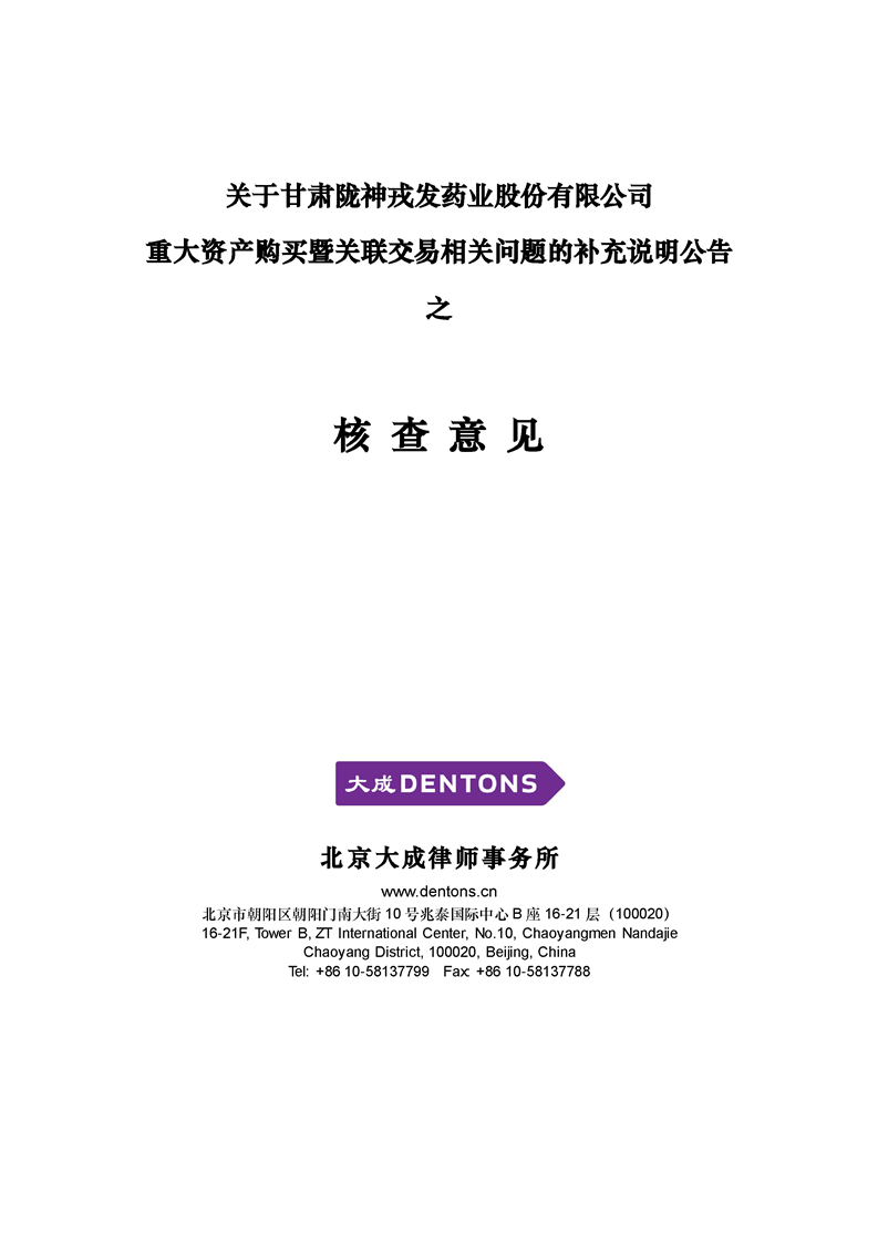 北京大成律師事務(wù)所關(guān)于甘肅隴神戎發(fā)藥業(yè)股份有限公司重大資產(chǎn)購買暨關(guān)聯(lián)交易相關(guān)問題的補充說明公告之核查意見