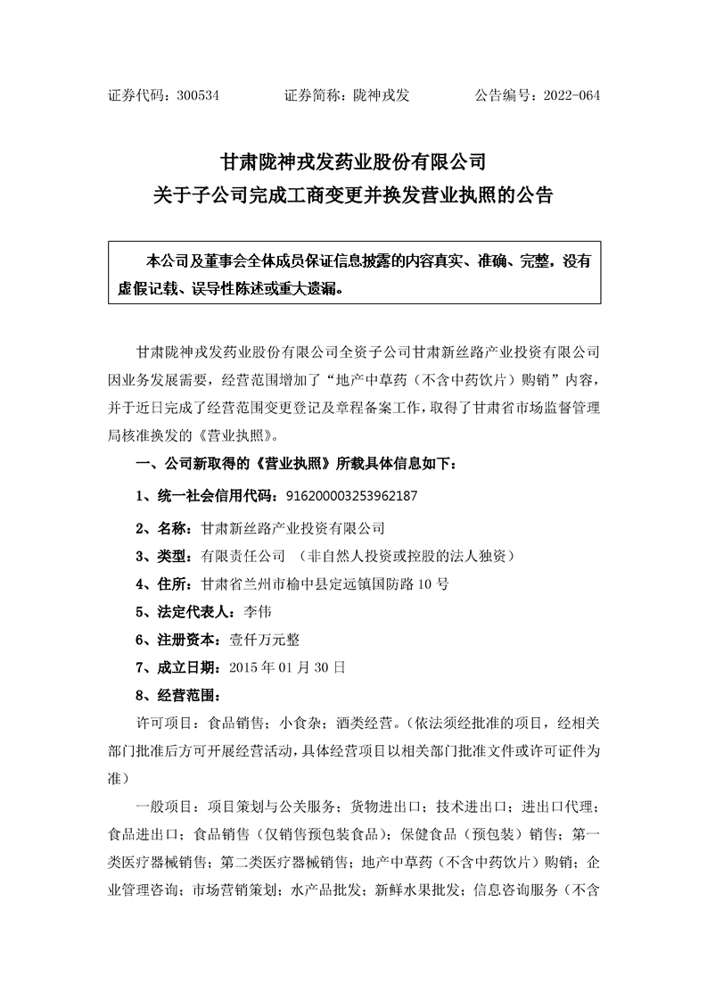 關(guān)于子公司完成工商變更并換發(fā)營業(yè)執(zhí)照的公告