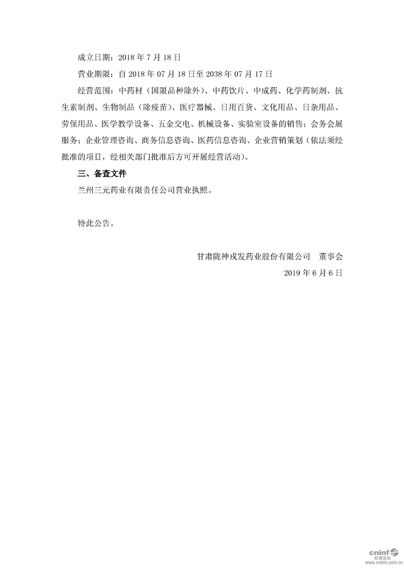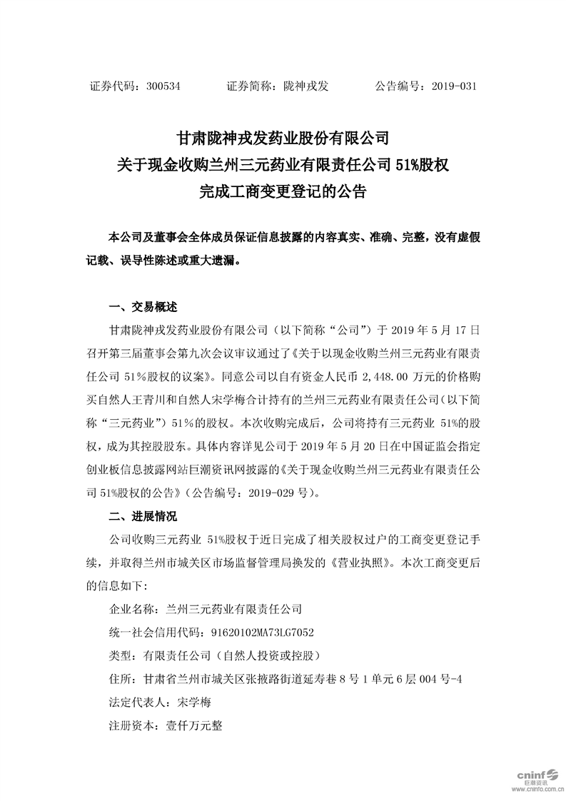 關于現金收購蘭州三元藥業有限責任公司51%股權完成工商變更登記的公告