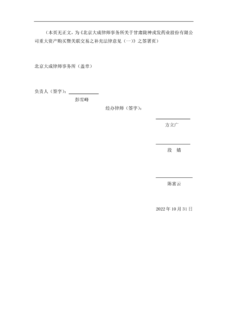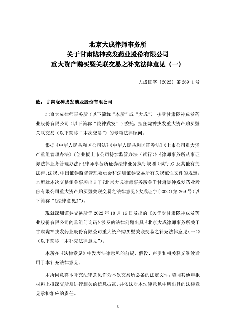 北京大成律師事務所關于甘肅隴神戎發藥業股份有限公司重大資產購買暨關聯交易補充法律意見(一)