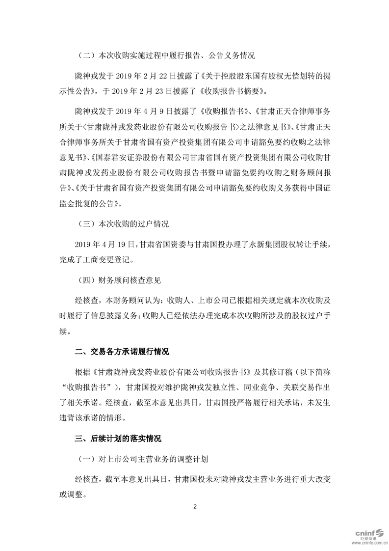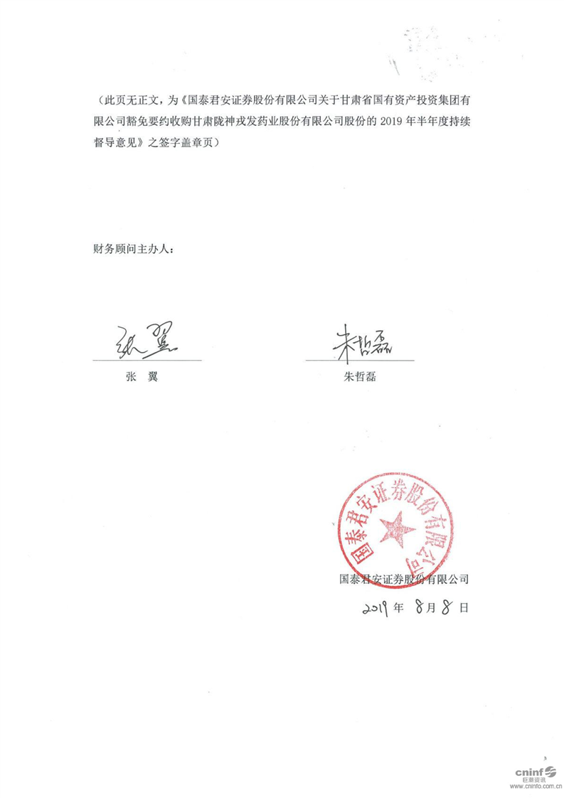 國泰君安證券股份有限公司關(guān)于甘肅省國有資產(chǎn)投資集團有限公司豁免要約收購公司股份的2019年半年度持續(xù)督導意見