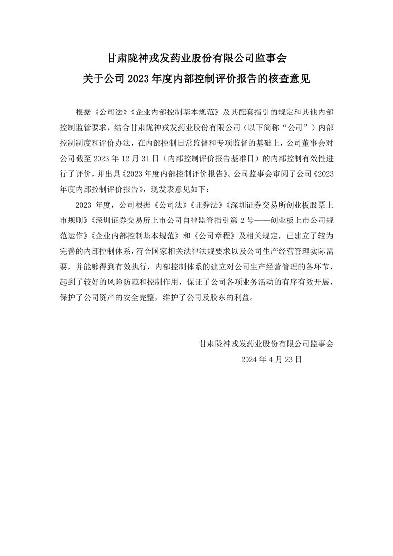 監事會關于公司2023年度內部控制評價報告的核查意見