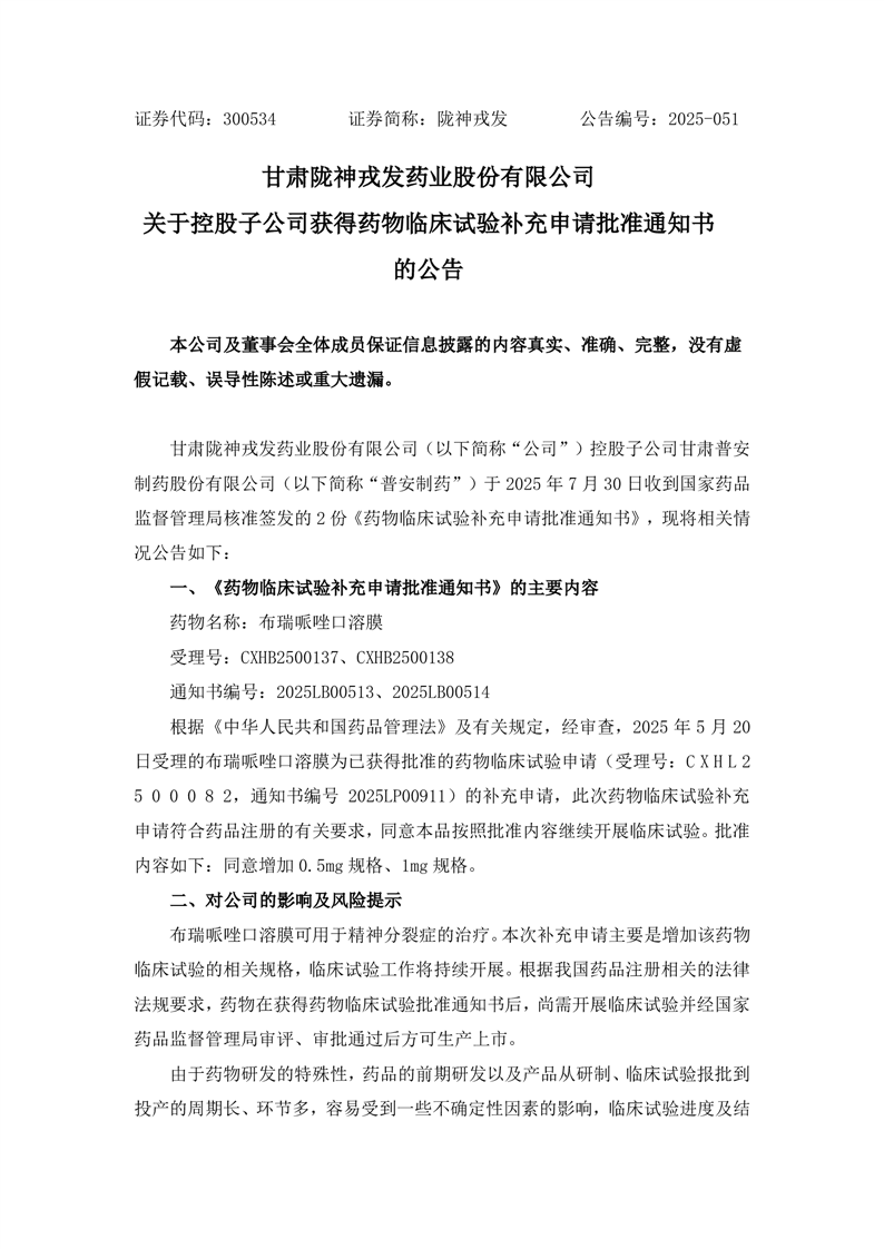 關(guān)于控股子公司獲得藥物臨床試驗補充申請批準(zhǔn)通知書的公告