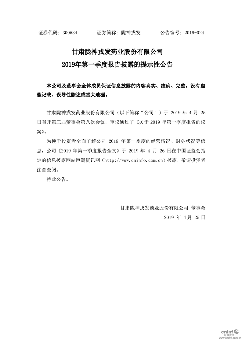 2019年第一季度報告披露的提示性公告