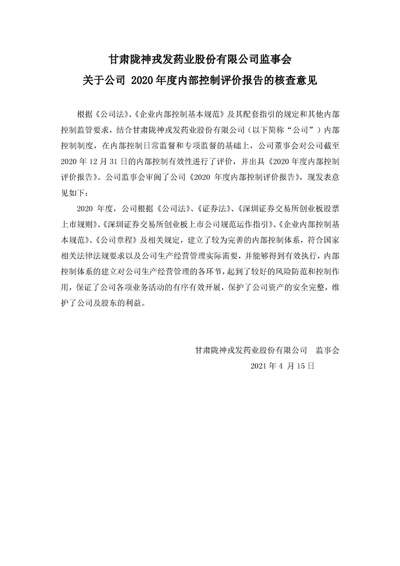 監事會關于公司2020年度內部控制評價報告的核查意見