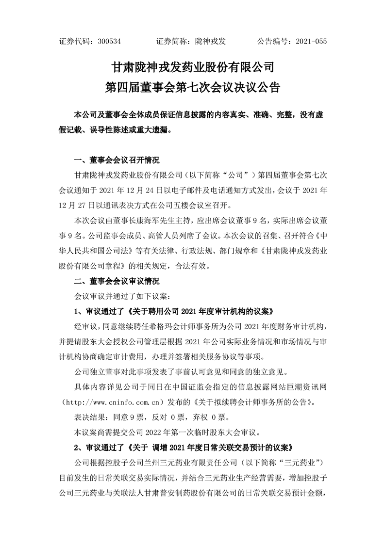 第四屆董事會第七次會議決議公告