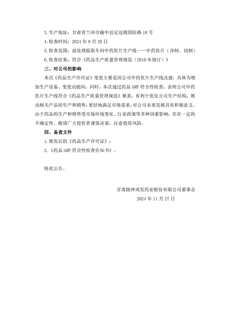 關于取得換發后的《藥品生產許可證》以及通過藥品GMP符合性檢查的公告