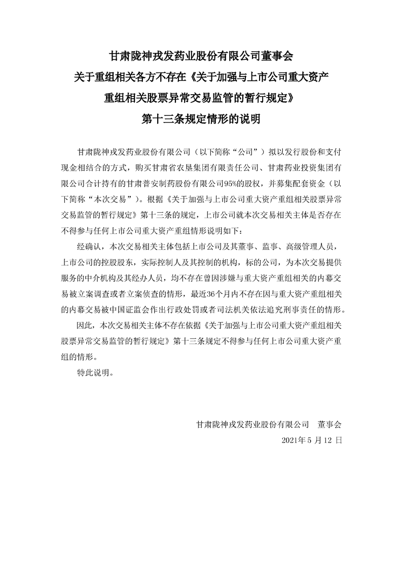 董事會(huì)關(guān)于重組相關(guān)各方不存在《關(guān)于加強(qiáng)與上市公司重大資產(chǎn)重組相關(guān)股票異常交易監(jiān)管的暫行規(guī)定》第十三條規(guī)定情形的說(shuō)明