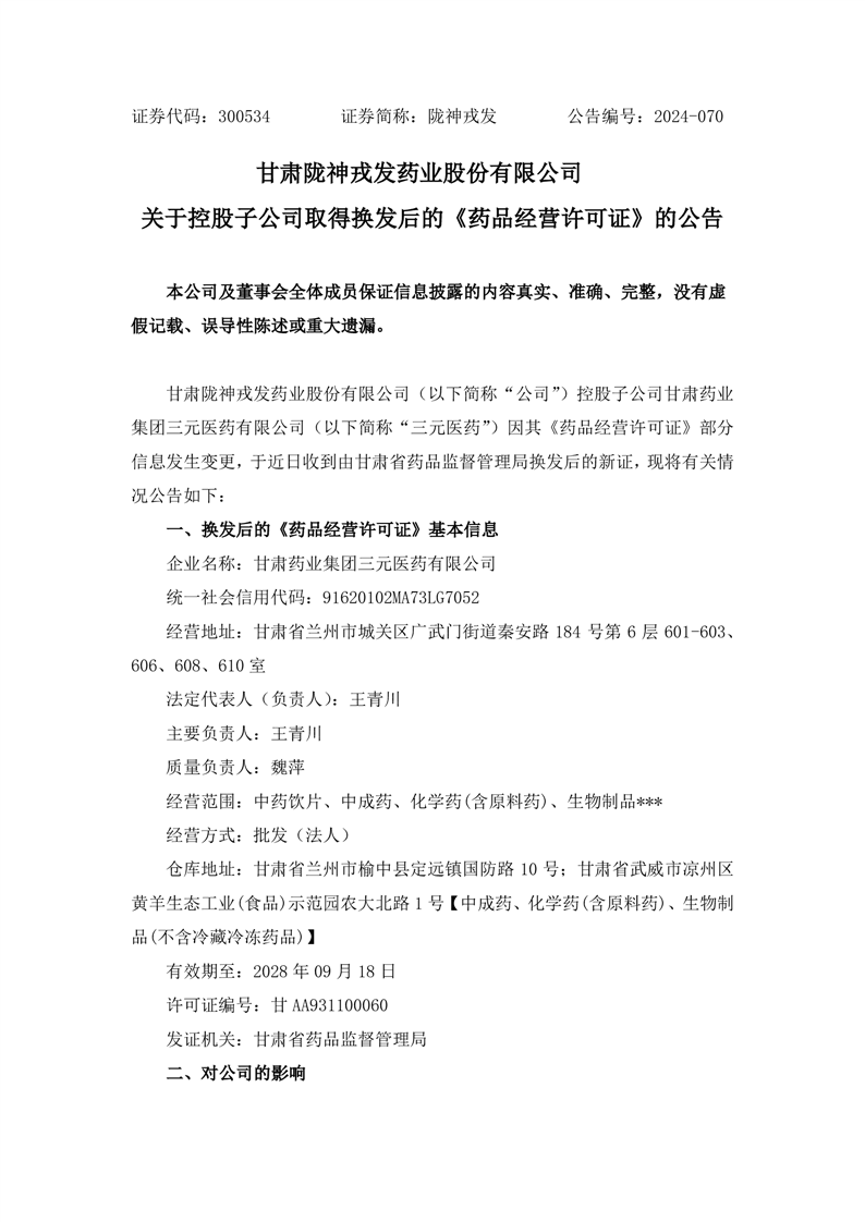關(guān)于控股子公司取得換發(fā)后的《藥品經(jīng)營(yíng)許可證》的公告