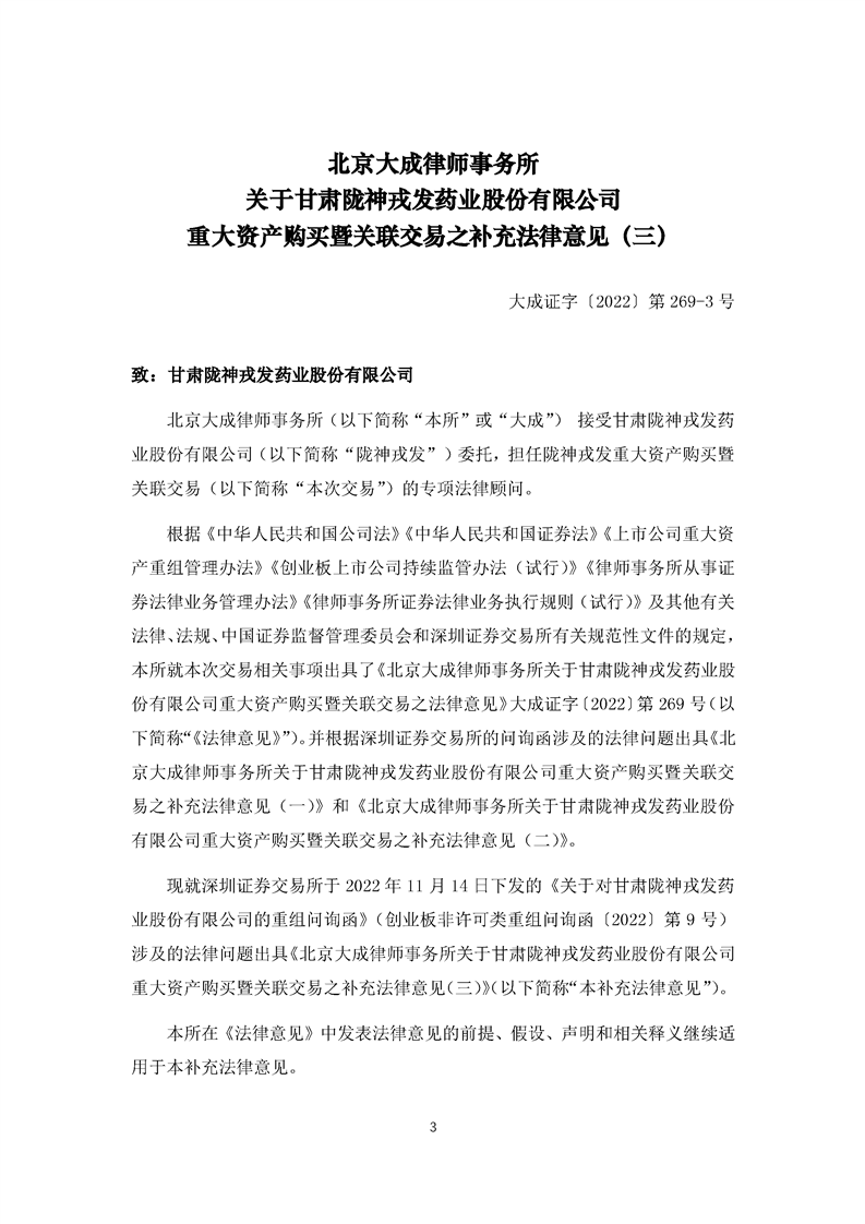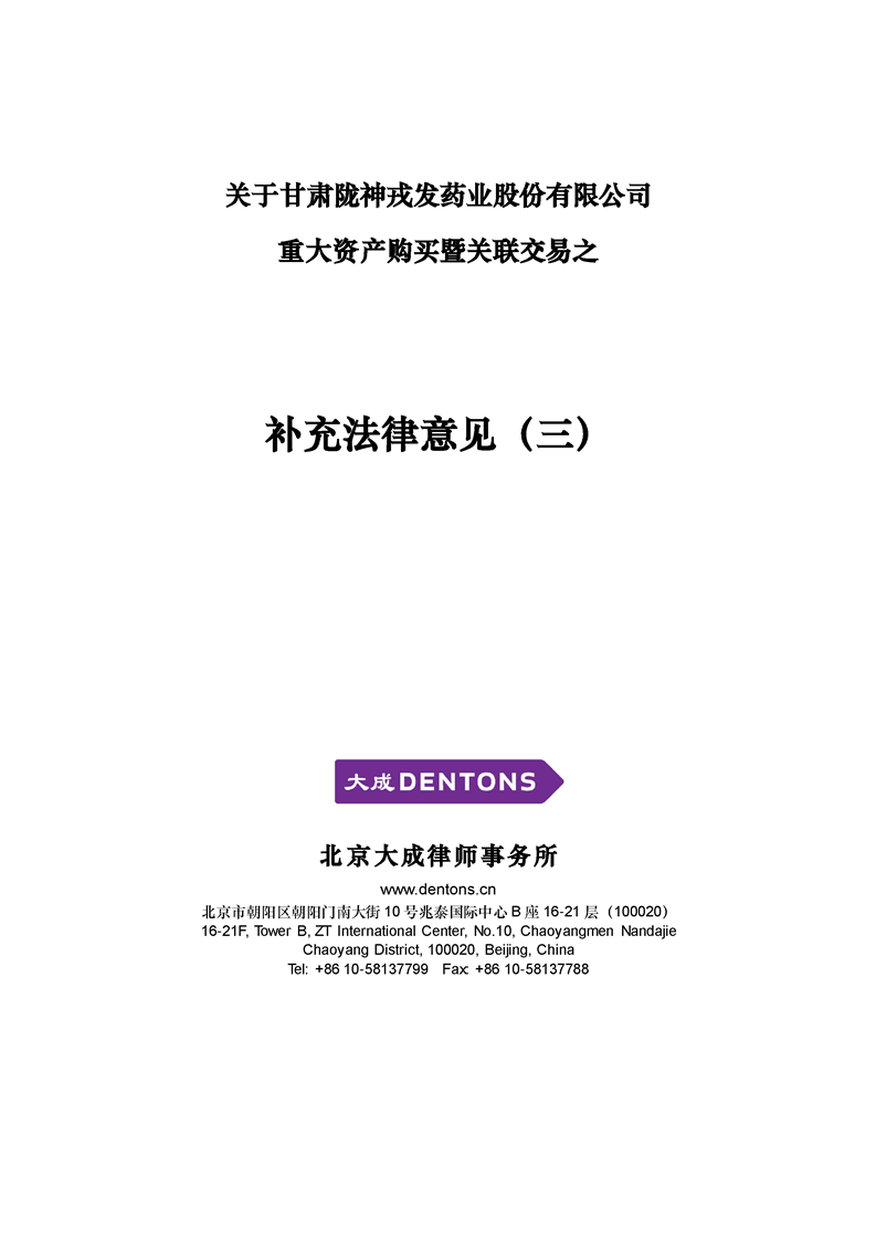 北京大成律師事務所關于甘肅隴神戎發藥業股份有限公司重大資產購買暨關聯交易補充法律意見(三)