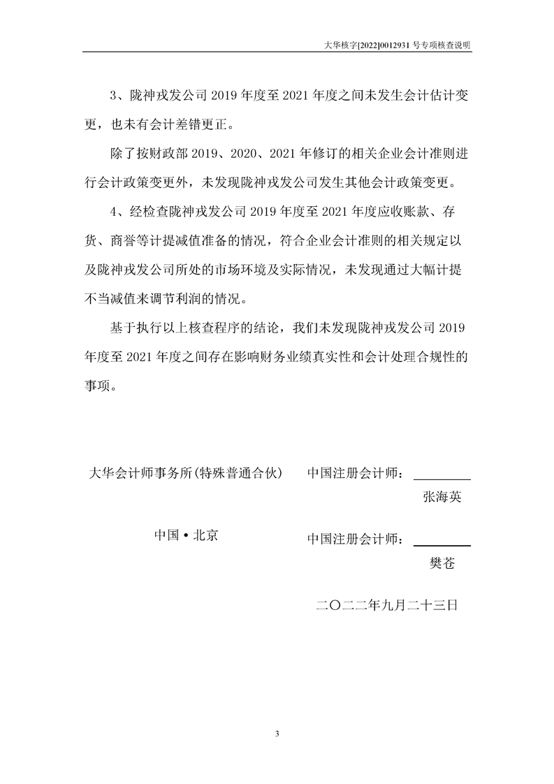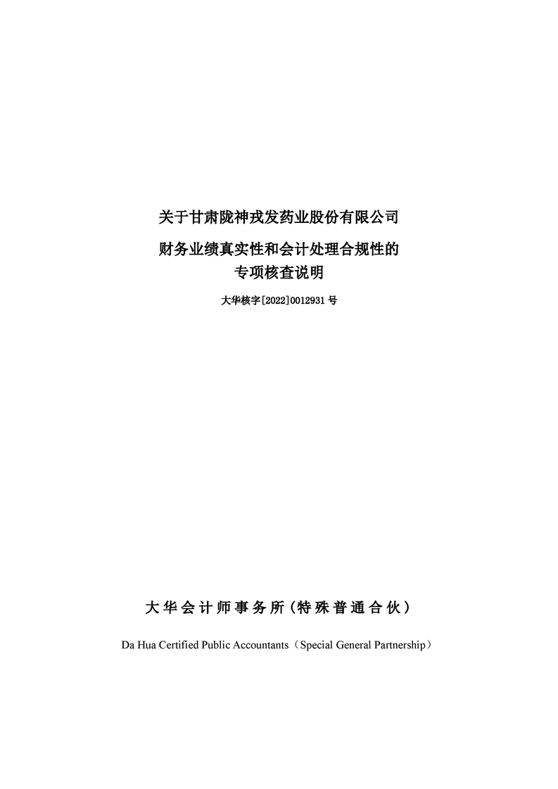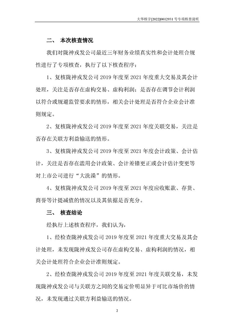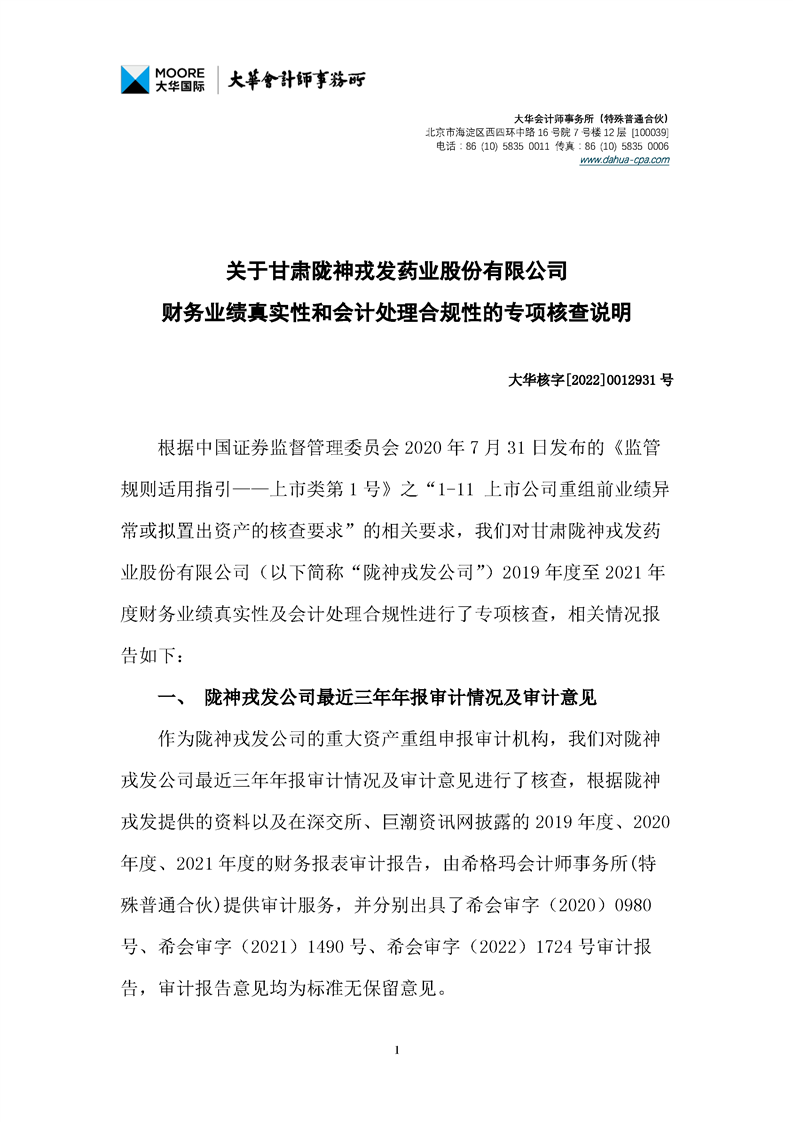 大華會(huì)計(jì)師事務(wù)所關(guān)于隴神戎發(fā)財(cái)務(wù)業(yè)績(jī)真實(shí)性和會(huì)計(jì)處理合規(guī)性的專項(xiàng)核查說(shuō)明