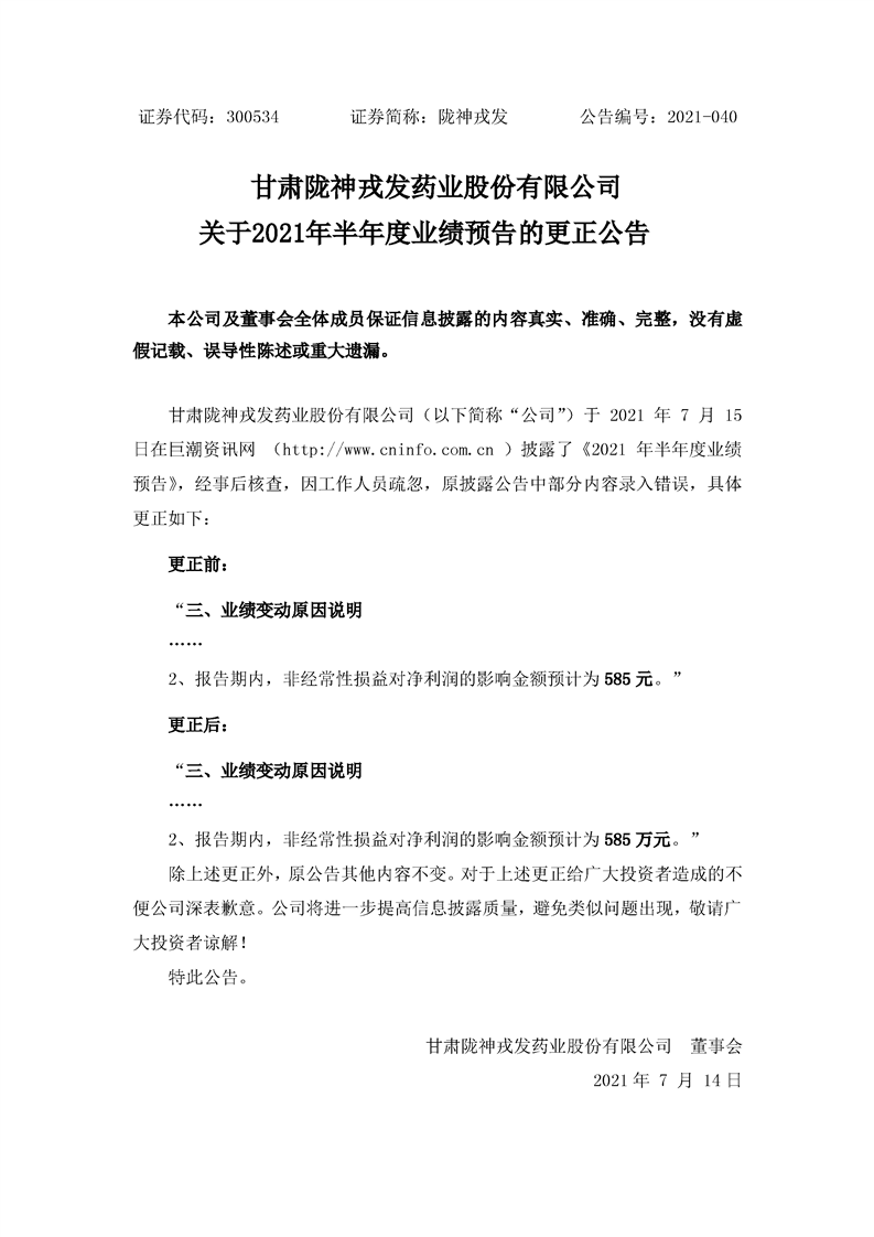 關于2021年半年度業績預告的更正公告