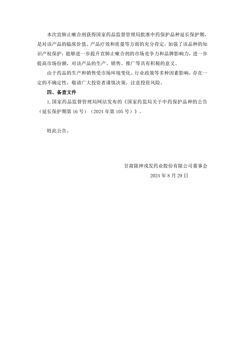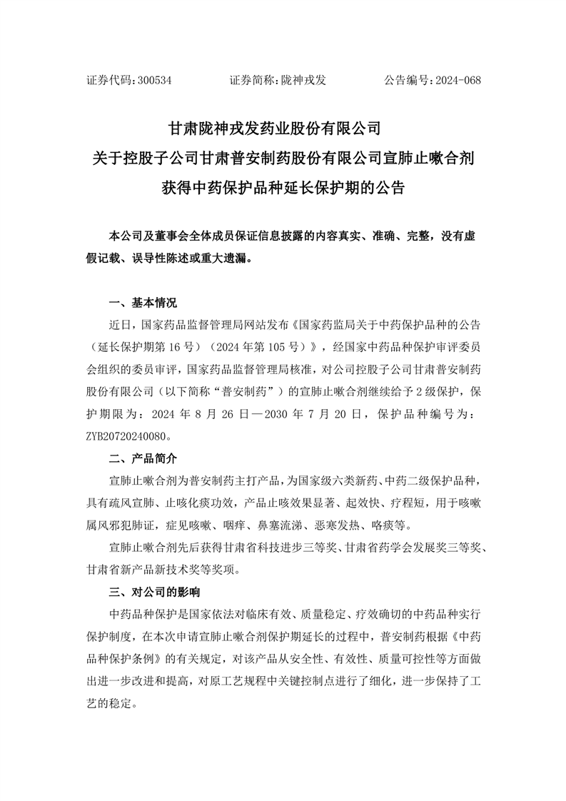 關于控股子公司甘肅普安制藥股份有限公司宣肺止嗽合劑獲得中藥保護品種延長保護期的公告