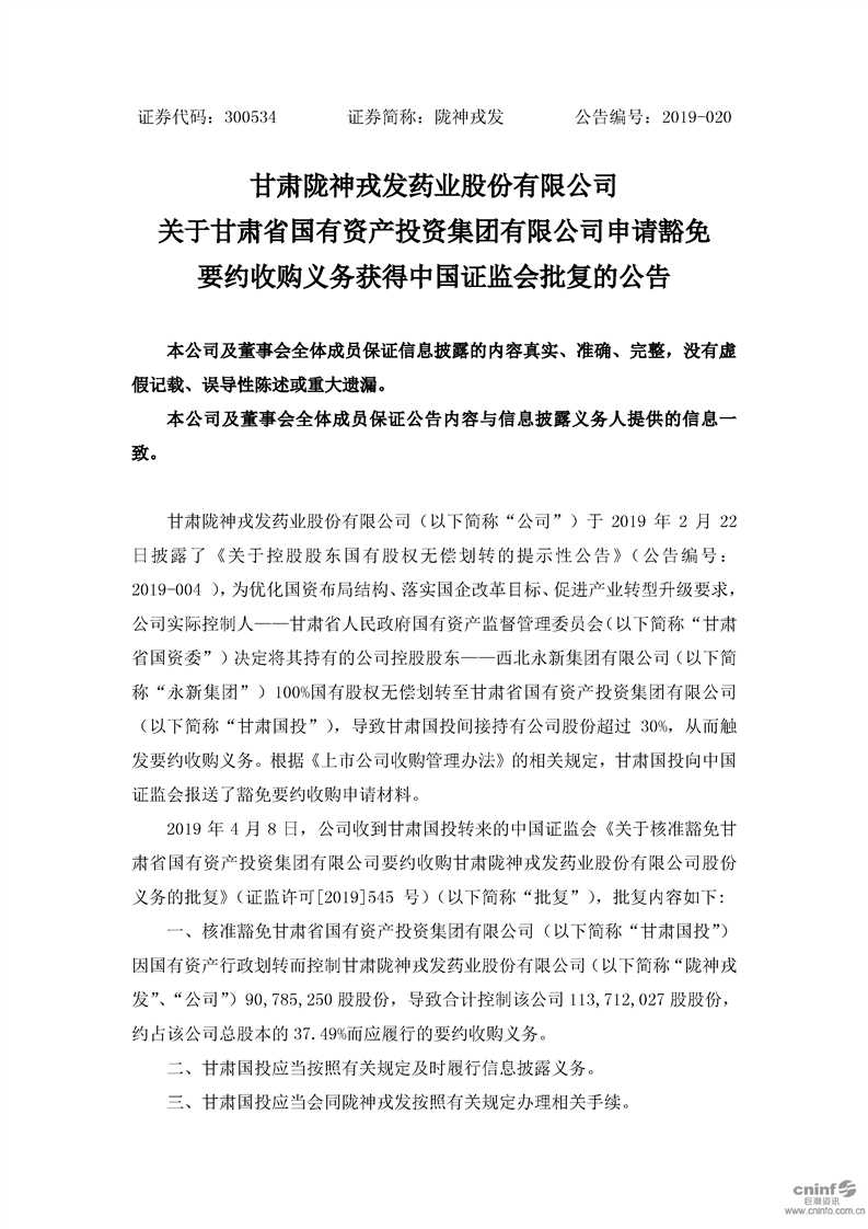 關于甘肅省國有資產投資集團有限公司申請豁免要約收購義務獲得中國證監會批復的公告