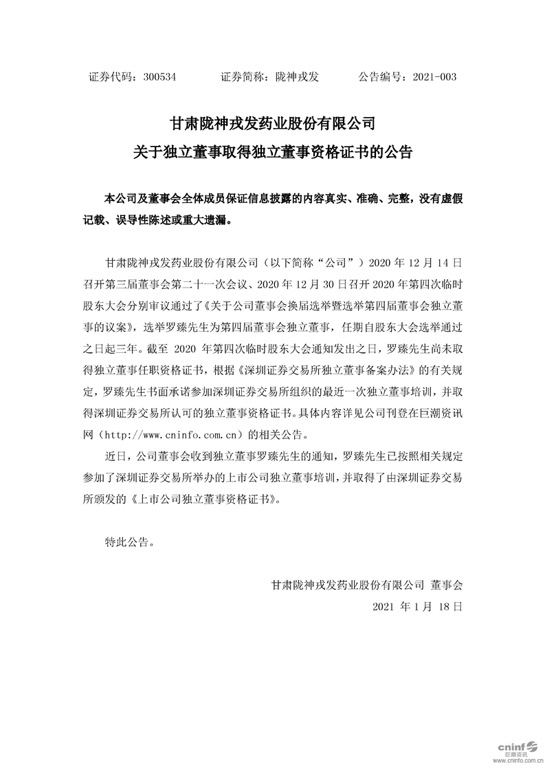 關于獨立董事取得獨立董事資格證書的公告