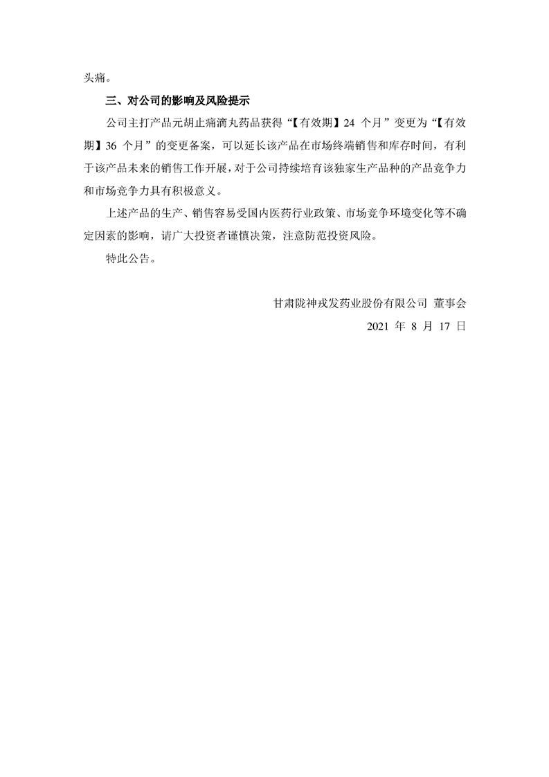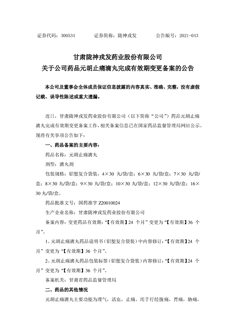 關于公司藥品元胡止痛滴丸完成有效期變更備案的公告