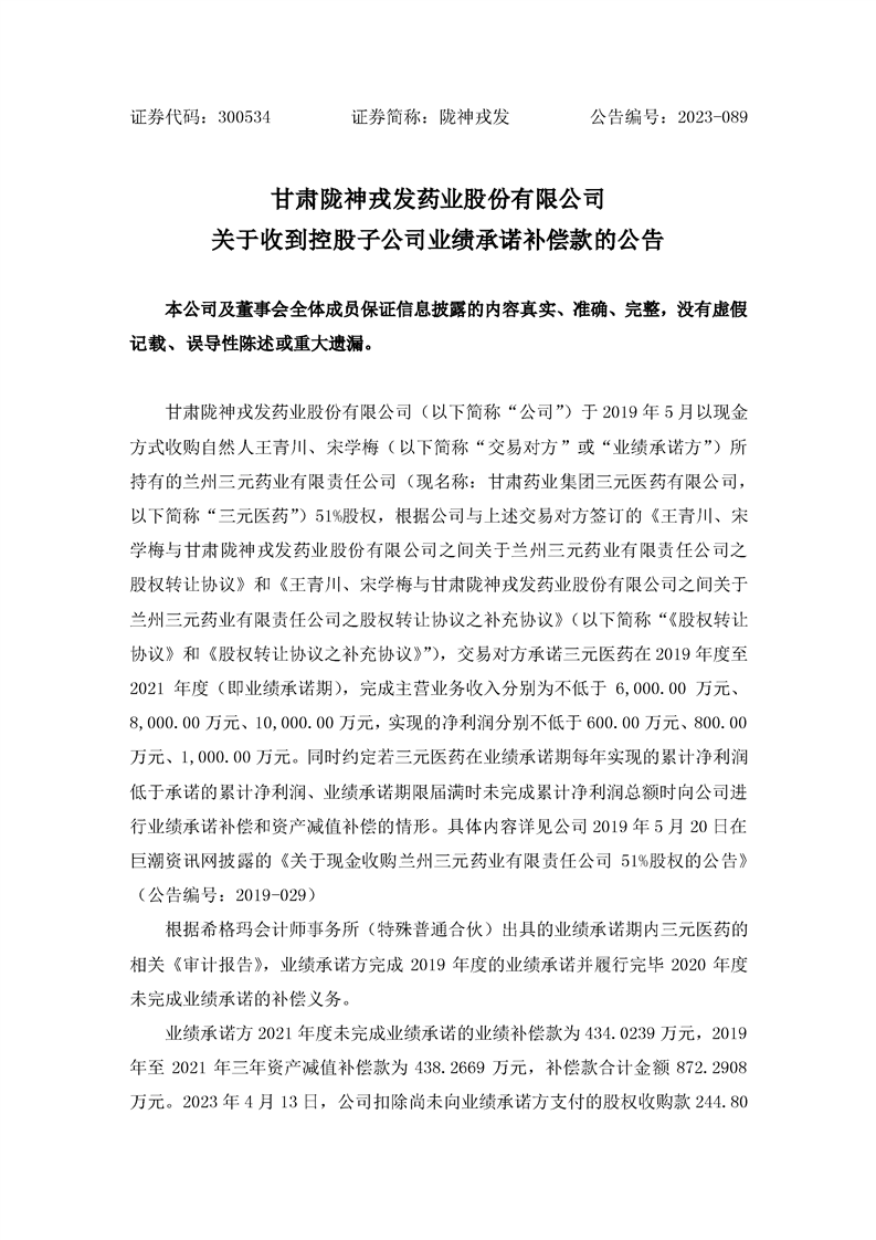關于收到控股子公司業(yè)績承諾補償款的公告