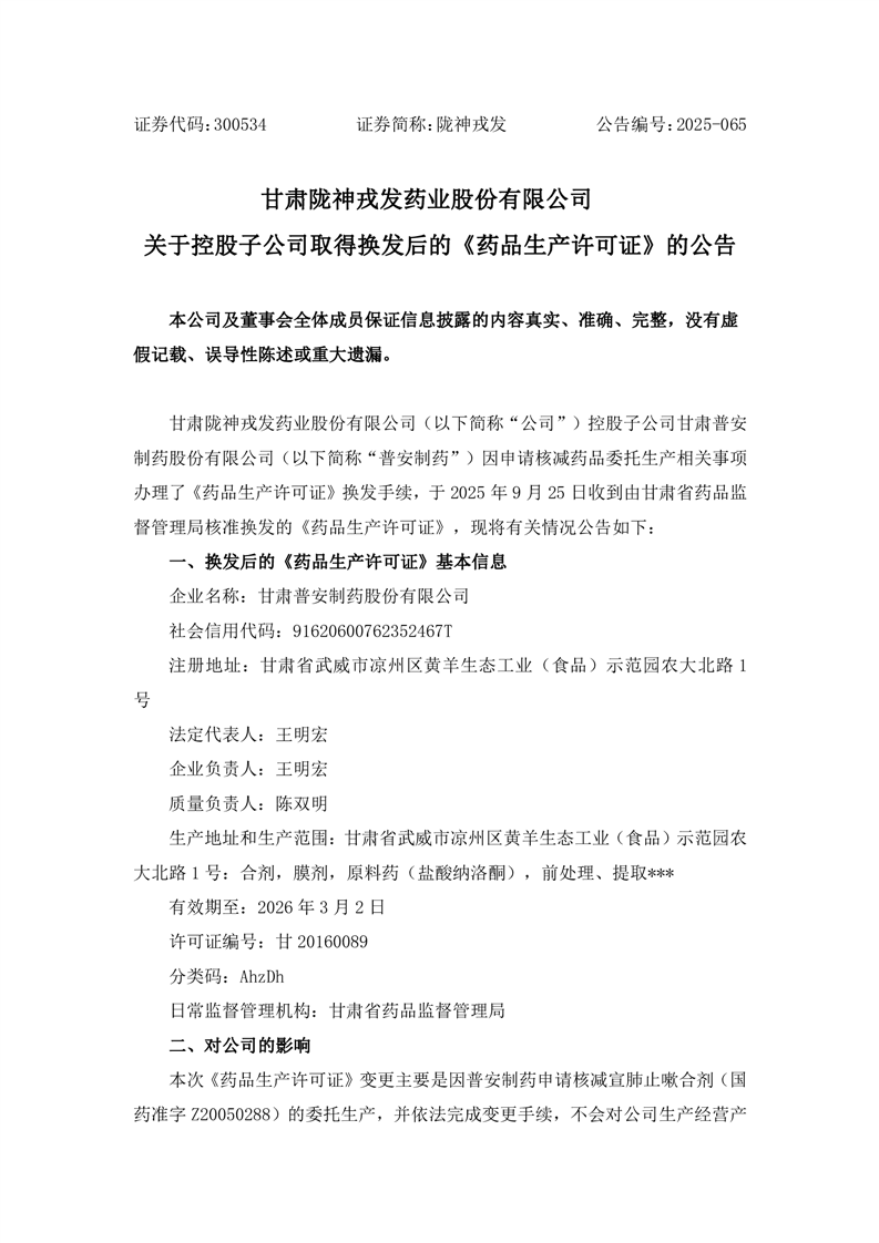 關于控股子公司取得換發后的《藥品生產許可證》的公告