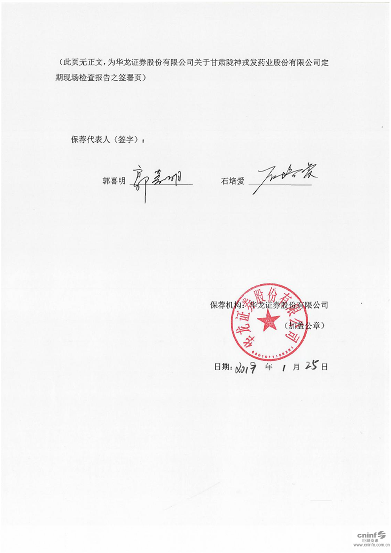 華龍證券股份有限公司關于甘肅隴神戎發藥業股份有限公司 2018 年持續督導定期現場檢查報告