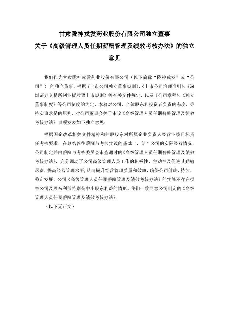 獨立董事關于《高級管理人員任期薪酬管理及績效考核辦法》的獨立意見