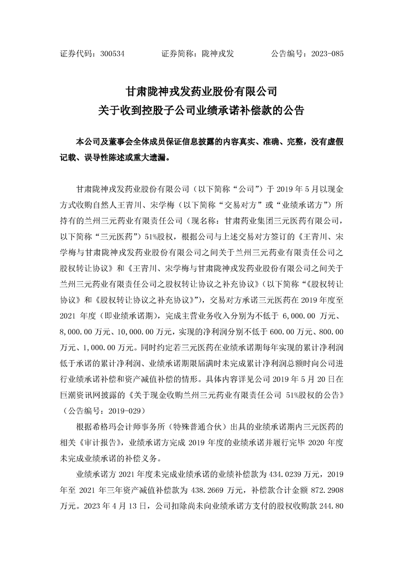 關(guān)于收到控股子公司業(yè)績承諾補償款的公告