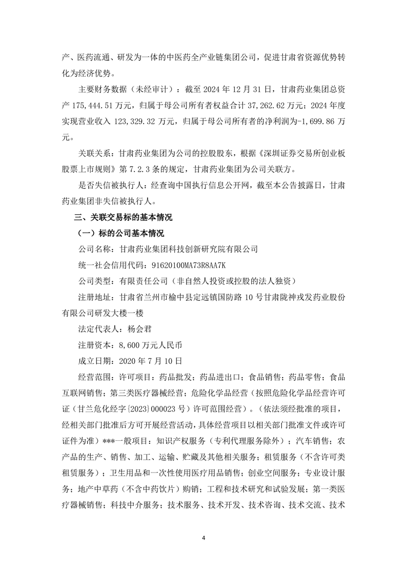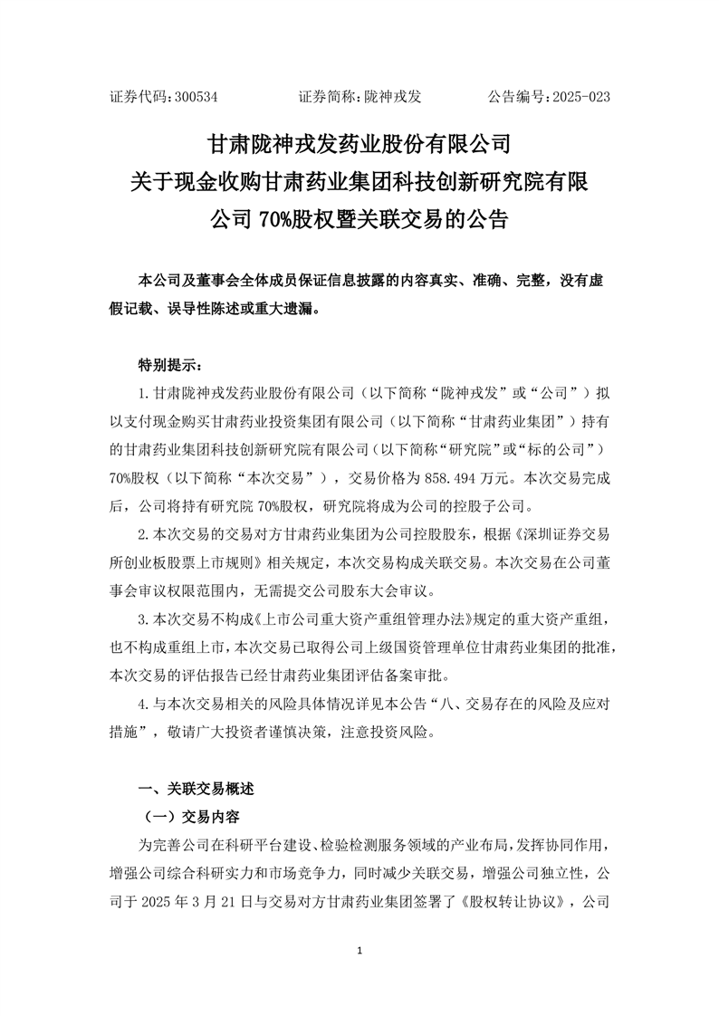 關于現金收購甘肅藥業集團科技創新研究院有限公司70%股權暨關聯交易的公告