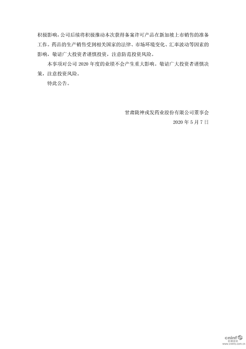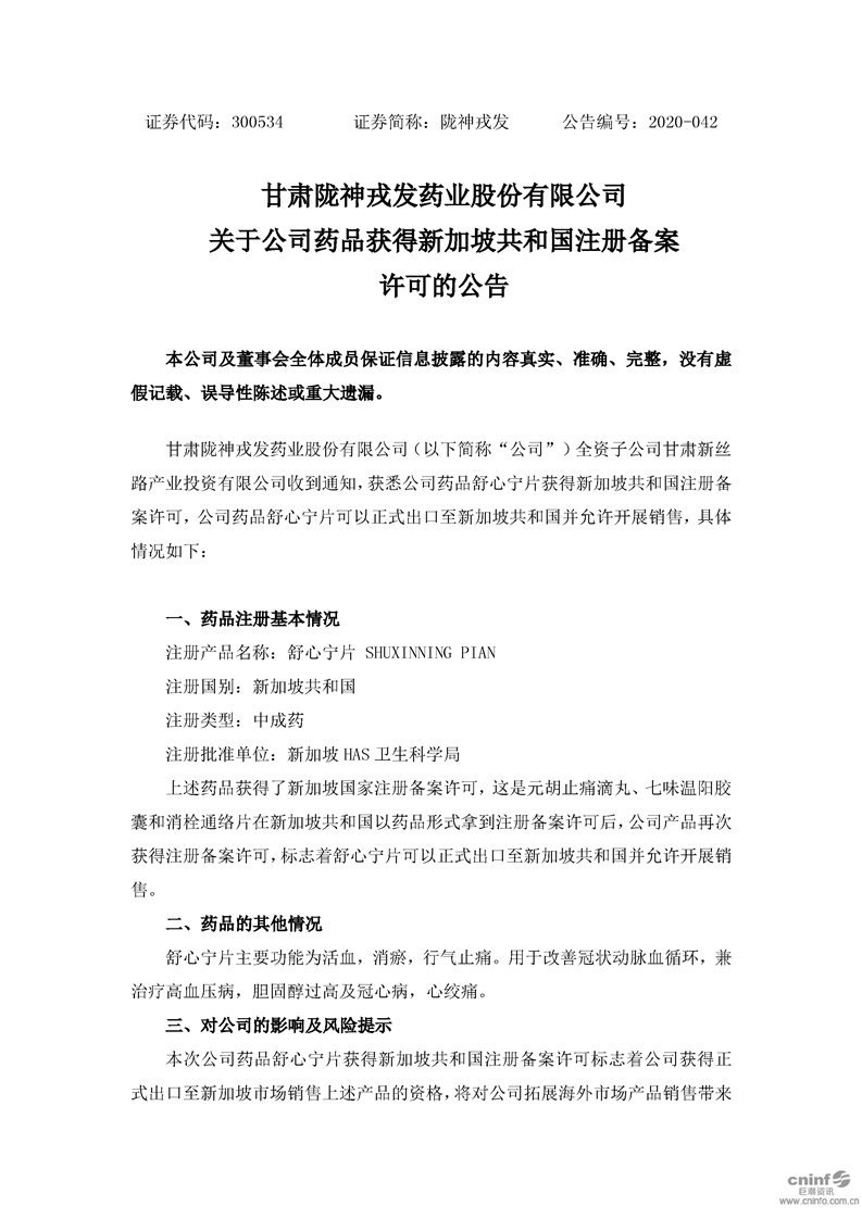 關于公司藥品獲得新加坡共和國注冊備案許可的公告