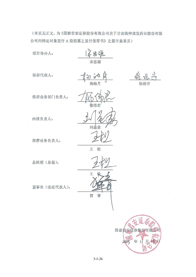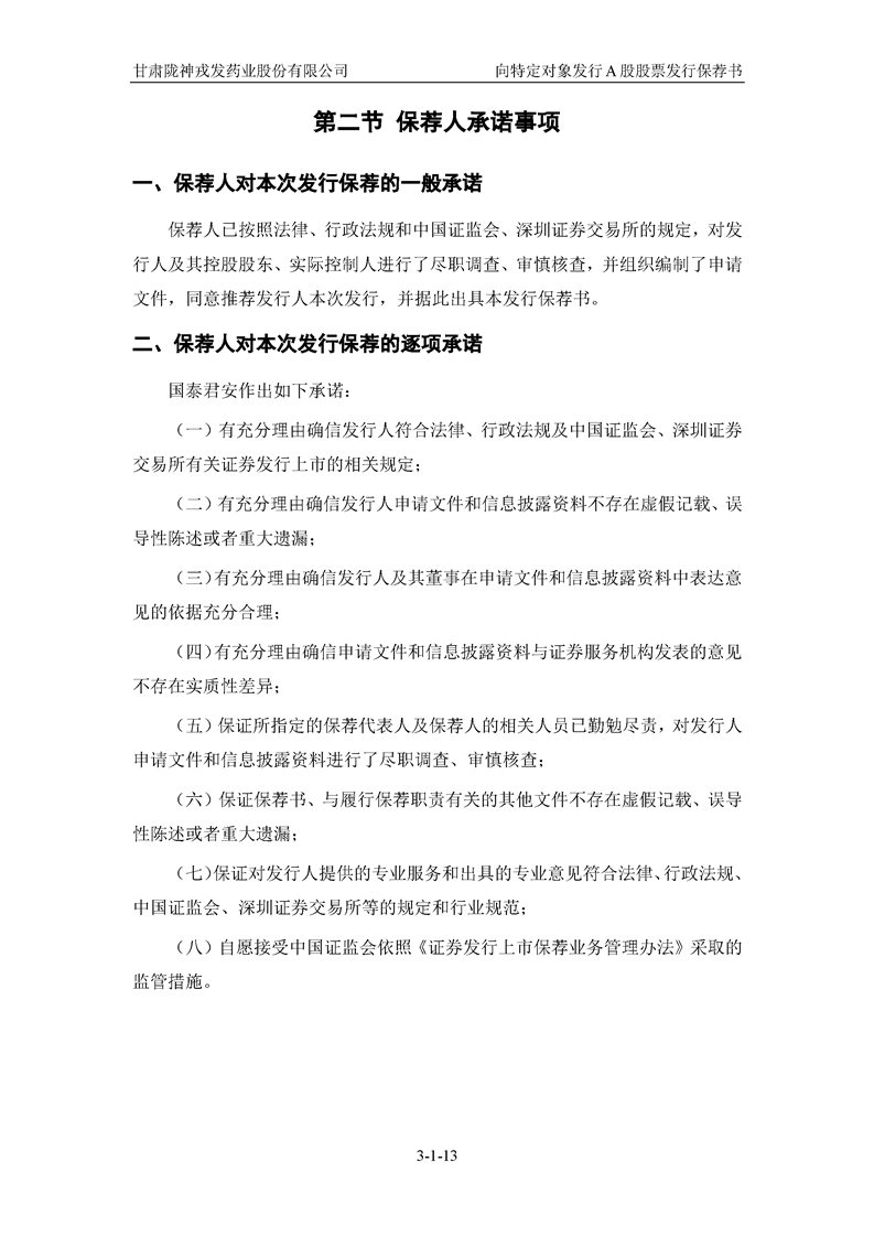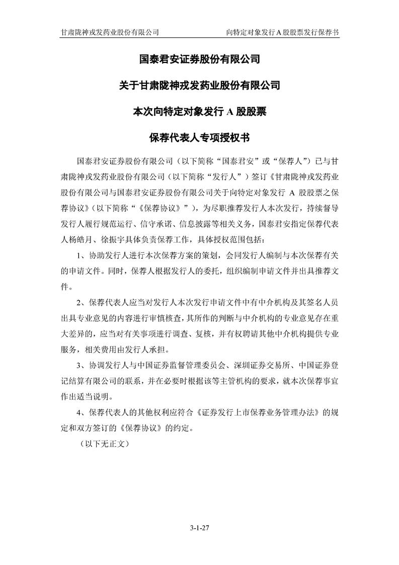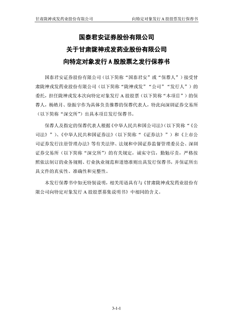 國泰君安證券股份有限公司關于甘肅隴神戎發藥業股份有限公司向特定對象發行A股股票之發行保薦書