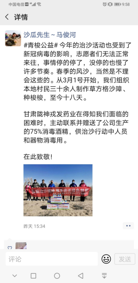 2020年3月16日,甘肅隴神戎發(fā)藥業(yè)股份有限公司志愿者一行4人與甘肅衛(wèi)視《好人在身邊》欄目組驅(qū)車400多公里,來到位于甘肅省武威市民勤縣的騰格里沙漠最西端,在一望無際的沙漠戈壁中學(xué)習(xí)打草格、種梭梭樹,感受了治沙志愿者為民勤的治沙事業(yè)所付出的艱辛勞動(dòng)。公司副總經(jīng)理錢雙喜代表隴神戎發(fā)為“青梭公益”的志愿者捐贈(zèng)公司生產(chǎn)的75%的乙醇消毒液,用于治沙志愿者在治沙過程中人員和器皿的消毒。
