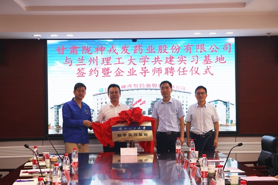 2020年7月3日上午,甘肅隴神戎發藥業股份有限公司與蘭州理工大學大學共建實習基地在隴神戎發正式揭牌設立。蘭州理工大學生命科學與工程學院院長黨委書記陳永泰、副院長任海偉,隴神戎發黨委書記、總經理康永紅,黨委專職副書記張金德共同為實習基地揭牌。副總經理兼董事會秘書元勤輝主持揭牌儀式。隴神戎發副總經理、財務總監張帆,副總經理錢雙喜,總工程師鄧月婷,蘭州理工大學生命科學與工程學院制藥工程系主任楊林及部分老師,公司在職部分校友出席了此次儀式。
