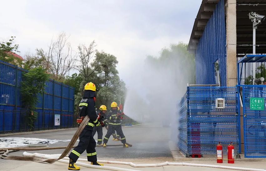 15時40分,火勢因泄漏量增大突然升級——10號罐底部出液閥燃起火焰,熱輻射導致相鄰罐溫度快速攀升。“啟動一級應急響應!”現場總指揮下達指令:“疏散組立即引導罐區周邊50米內人員撤離至安全區域;滅火組利用泡沫式滅火器壓制外圍火勢;通訊組聯系涼州區消防中隊請求支援!”