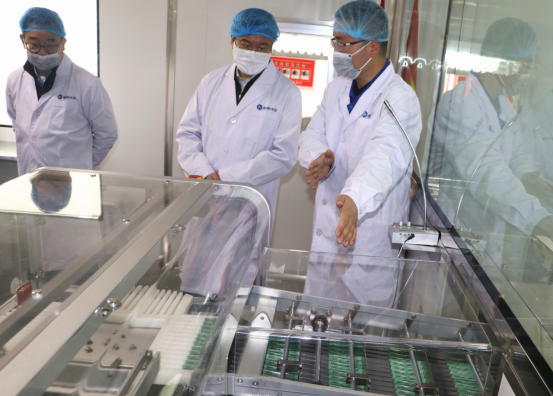 在外包車間,李榮燦在外包裝聯(lián)動(dòng)線前觀看了元胡止痛滴丸內(nèi)包及外包裝生產(chǎn)全過程。