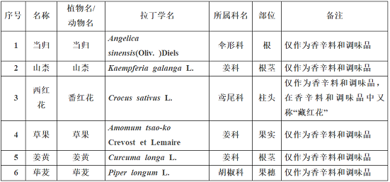 山柰、西紅花、草果、姜黃、蓽茇。在《中國藥典》(2015年版)收載。我國傳統將山柰、西紅花、草果、姜黃、蓽茇作為香辛料和調味品食用,且列入《香辛料和調味品 名稱》(GB/T 12729.1-2008)。在食藥物質目錄中所列的基源植物和食用部分與《中國藥典》記載一致。