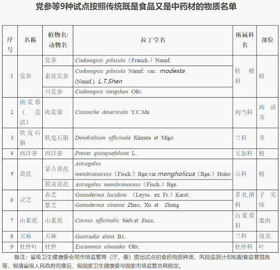 關于對黨參等9種物質開展按照傳統既是食品又是中藥材的物質管理試點工作的通知