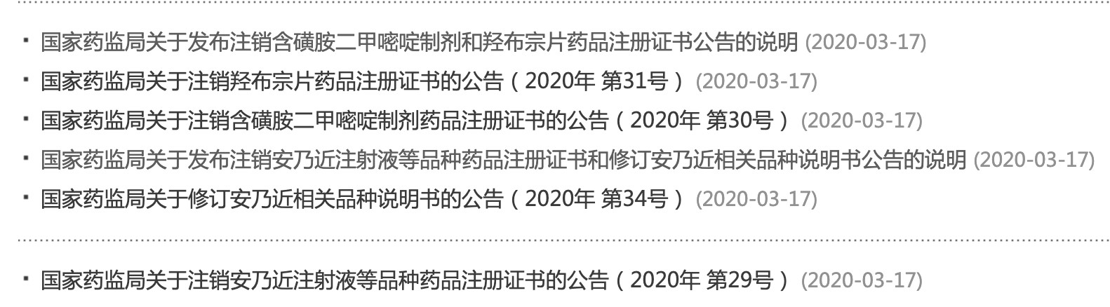 2020年03月17日國(guó)家藥品監(jiān)督管理局(NMPA)連續(xù)發(fā)布了6個(gè)關(guān)于安乃近注射液、含磺胺二甲嘧啶制劑、羥布宗片等品種注銷公告。
