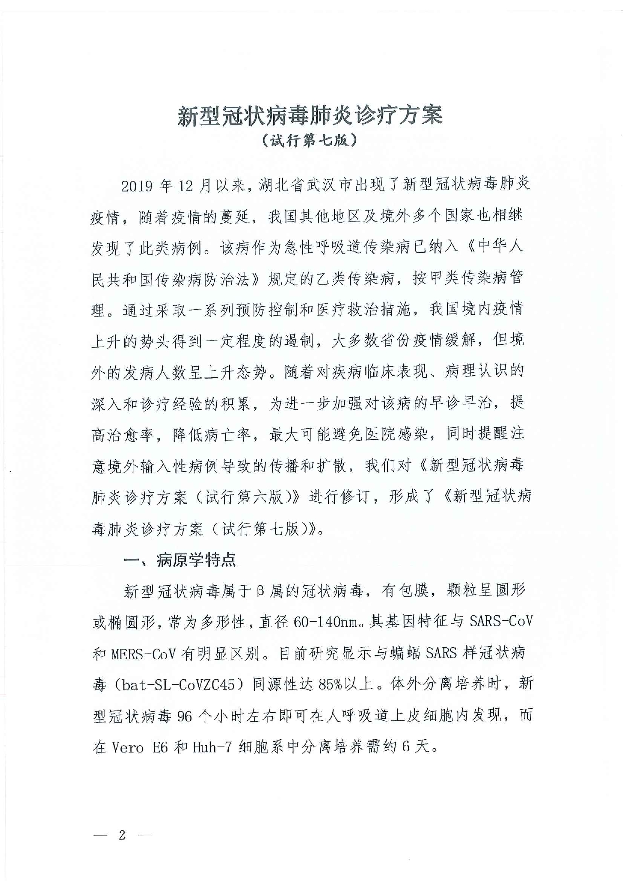 為進一步做好新型冠狀病毒肺炎病例診斷和醫療救治工作,我們組織專家在對前期醫療救治工作進行分析、研判、總結的基礎上,對診療方案進行修訂,形成了《新型冠狀病毒肺炎診療方案(試行第七版)》。現印發給你們,請參照執行。各有關醫療機構要在醫療救治工作中積極發揮中醫藥作用,加強中西醫結合,完善中西醫聯合會診制度,促進醫療救治取得良好效果。