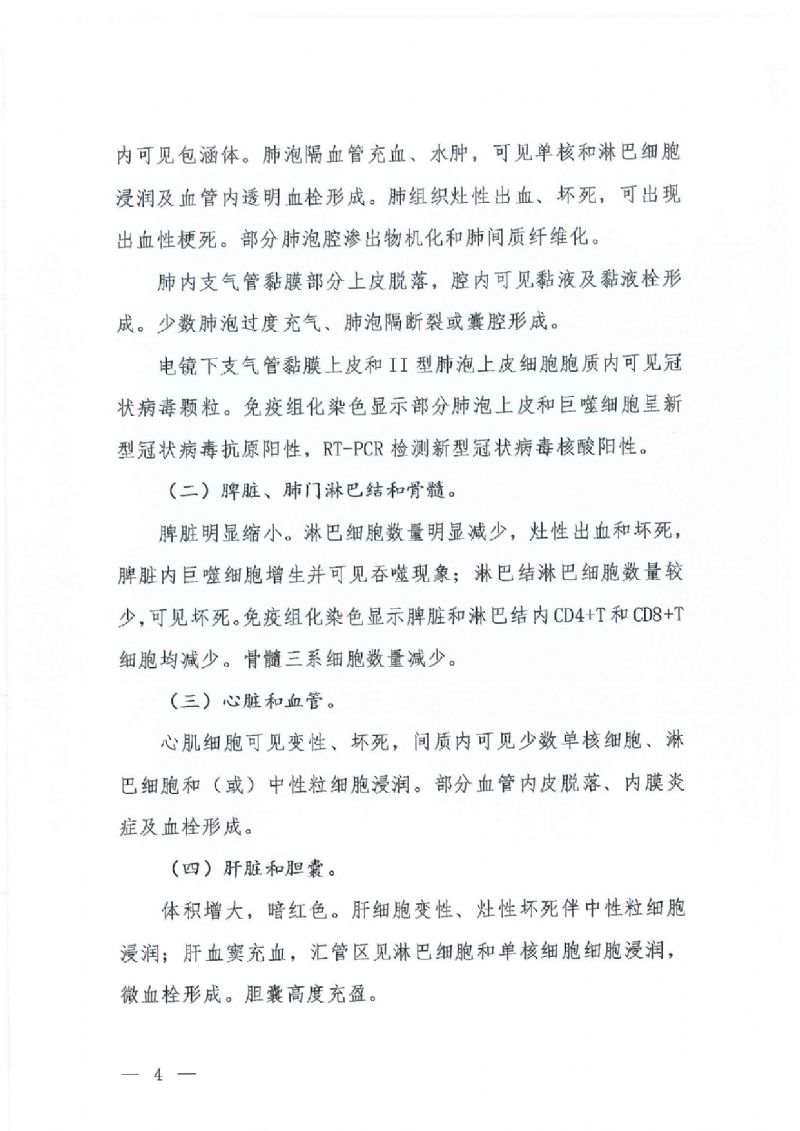 按照大體觀、鏡下觀分別對“肺臟、脾臟及肺門淋巴結、心臟和血管、肝臟和膽囊、腎臟、腦組織、腎上腺、食管、胃和腸管等器官”進行描述。以肺臟和免疫系統損害為主。其他臟器因基礎病不同而不同,多為繼發性損害。