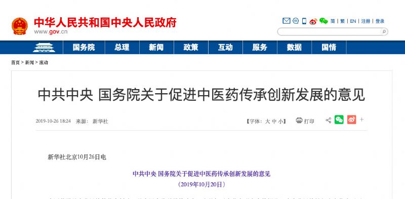 10月26日晚,國務院發(fā)布了《中共中央國務院關于促進中醫(yī)藥傳承創(chuàng)新發(fā)展的意見》(以下簡稱《意見》)。